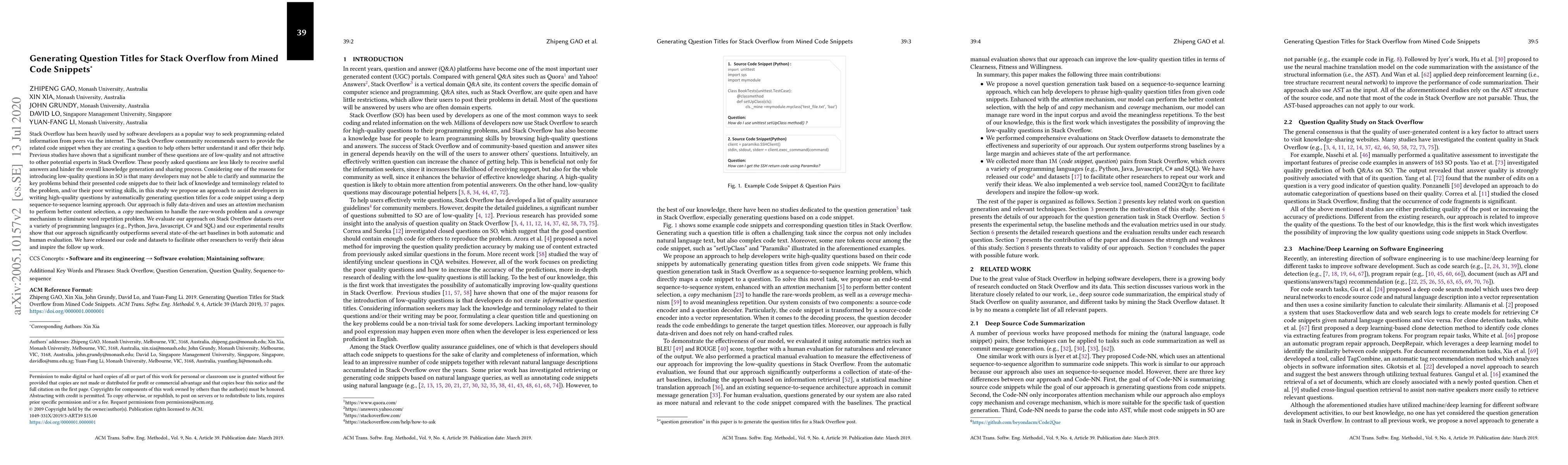 This paper proposes a deep sequence-to-sequence learning approach to automatically generate high-quality question titles for Stack Overflow from mined code snippets, addressing the issue of low-quality questions. The approach uses an attention mechanism, copy mechanism, and coverage mechanism to improve content selection and handle rare-words and repetition issues, outperforming state-of-the-art baselines in both automatic and human evaluations.