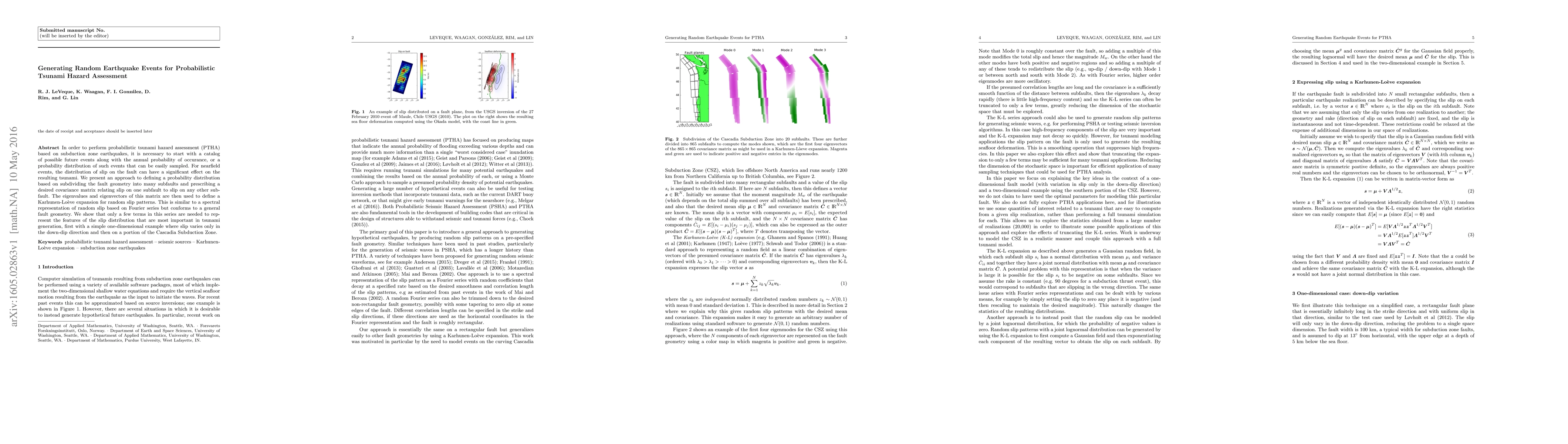 In order to perform probabilistic tsunami hazard assessment (PTHA) based on subduction zone earthquakes, it is necessary to start with a catalog of possible future events along with the annual probability of occurance, or a probability distribution of such events that can be easily sampled. For nearfield events, the distribution of slip on the fault can have a significant effect on the resulting tsunami. We present an approach to defining a probability distribution based on subdividing the fault geometry into many subfaults and prescribing a desired covariance matrix relating slip on one subfault to slip on any other subfault. The eigenvalues and eigenvectors of this matrix are then used to define a Karhunen-Lo\`eve expansion for random slip patterns. This is similar to a spectral representation of random slip based on Fourier series but conforms to a general fault geometry. We show that only a few terms in this series are needed to represent the features of the slip distribution that are most important in tsunami generation, first with a simple one-dimensional example where slip varies only in the down-dip direction and then on a portion of the Cascadia Subduction Zone.
