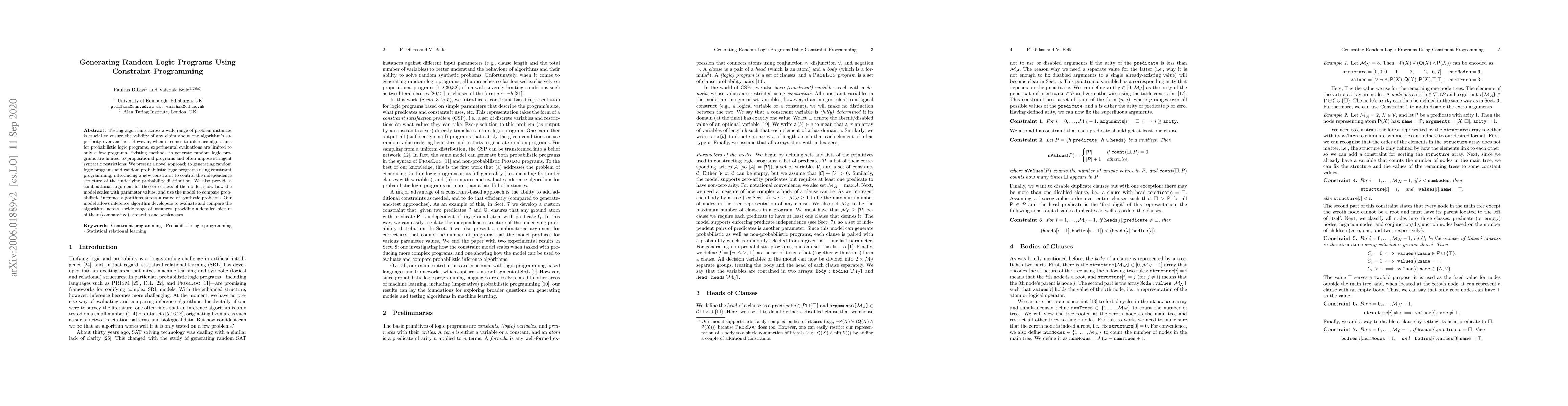 This paper introduces a new method for generating random logic and probabilistic logic programs using constraint programming, which overcomes limitations of existing methods. The approach allows for a broader evaluation of probabilistic inference algorithms by providing diverse, synthetic problem instances.