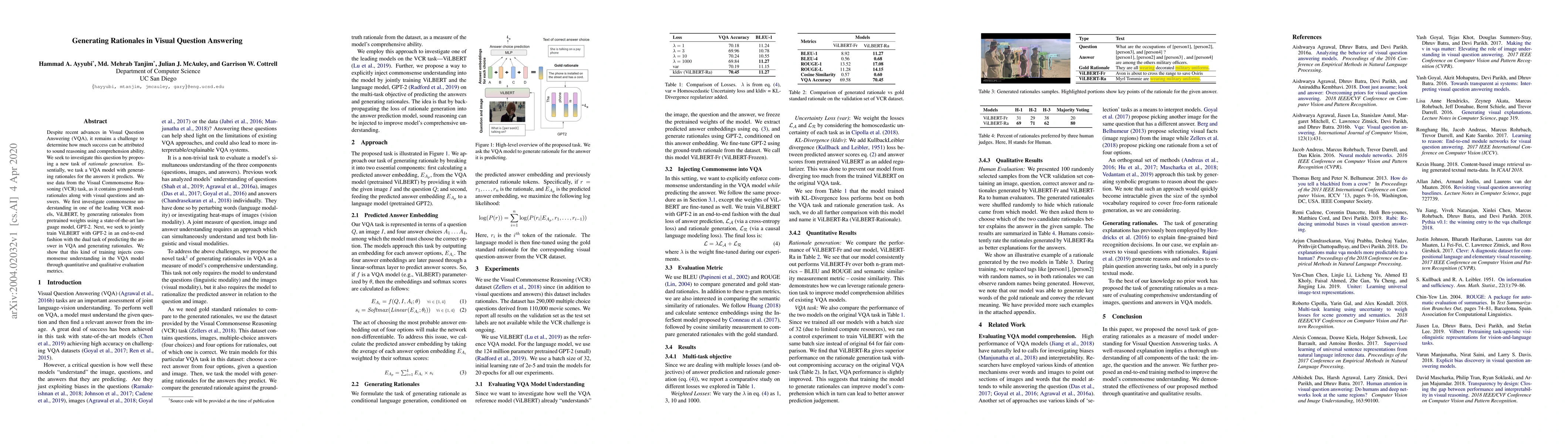 Despite recent advances in Visual QuestionAnswering (VQA), it remains a challenge todetermine how much success can be attributedto sound reasoning and comprehension ability.We seek to investigate this question by propos-ing a new task ofrationale generation. Es-sentially, we task a VQA model with generat-ing rationales for the answers it predicts. Weuse data from the Visual Commonsense Rea-soning (VCR) task, as it contains ground-truthrationales along with visual questions and an-swers. We first investigate commonsense un-derstanding in one of the leading VCR mod-els, ViLBERT, by generating rationales frompretrained weights using a state-of-the-art lan-guage model, GPT-2. Next, we seek to jointlytrain ViLBERT with GPT-2 in an end-to-endfashion with the dual task of predicting the an-swer in VQA and generating rationales. Weshow that this kind of training injects com-monsense understanding in the VQA modelthrough quantitative and qualitative evaluationmetrics