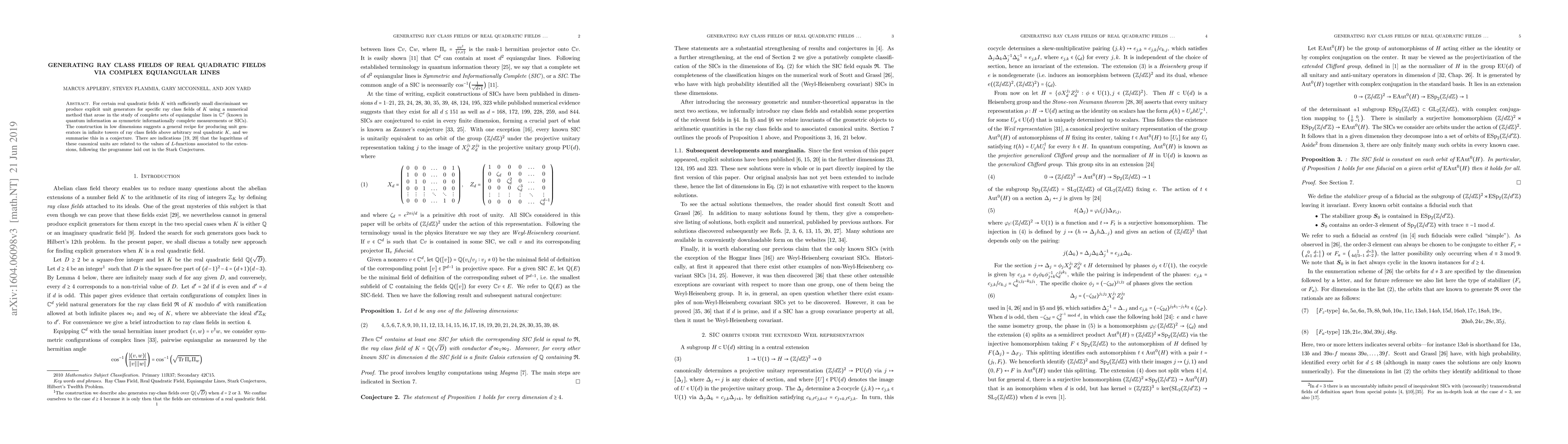 For certain real quadratic fields $K$ with sufficiently small discriminant we produce explicit unit generators for specific ray class fields of $K$ using a numerical method that arose in the study of complete sets of equiangular lines in $\mathbb{C}^d$ (known in quantum information as symmetric informationally complete measurements or SICs). The construction in low dimensions suggests a general recipe for producing unit generators in infinite towers of ray class fields above arbitrary real quadratic $K$, and we summarise this in a conjecture. There are indications [19,20] that the logarithms of these canonical units are related to the values of $L$-functions associated to the extensions, following the programme laid out in the Stark Conjectures.