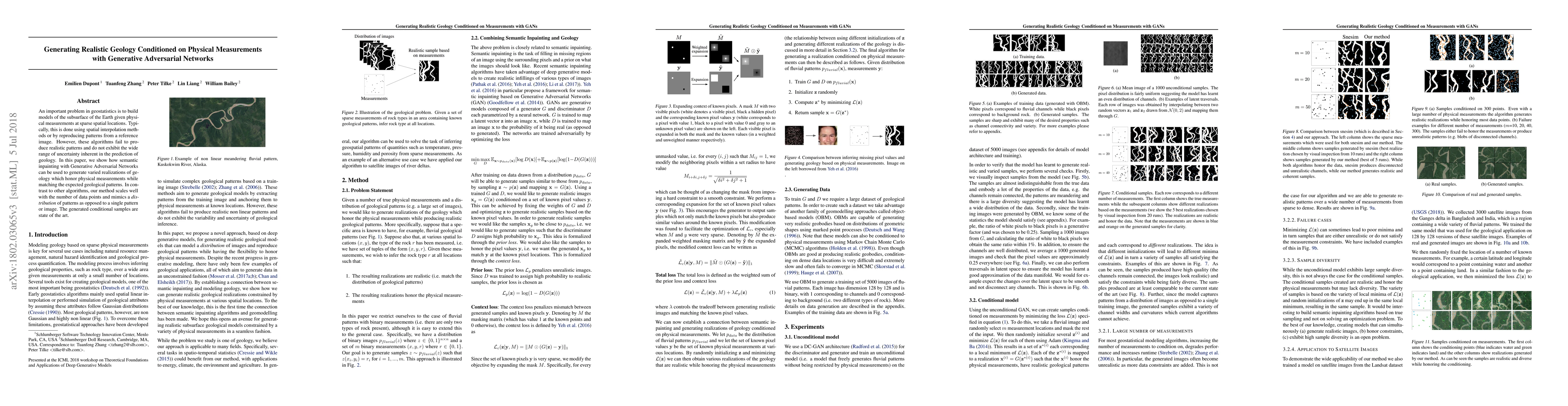 This paper proposes using Generative Adversarial Networks (GANs) for generating realistic geological models conditioned on sparse physical measurements, addressing the limitations of traditional interpolation methods. The GAN-based approach produces varied geological patterns that honor measurements and reflect the inherent uncertainty, scaling effectively with data points.