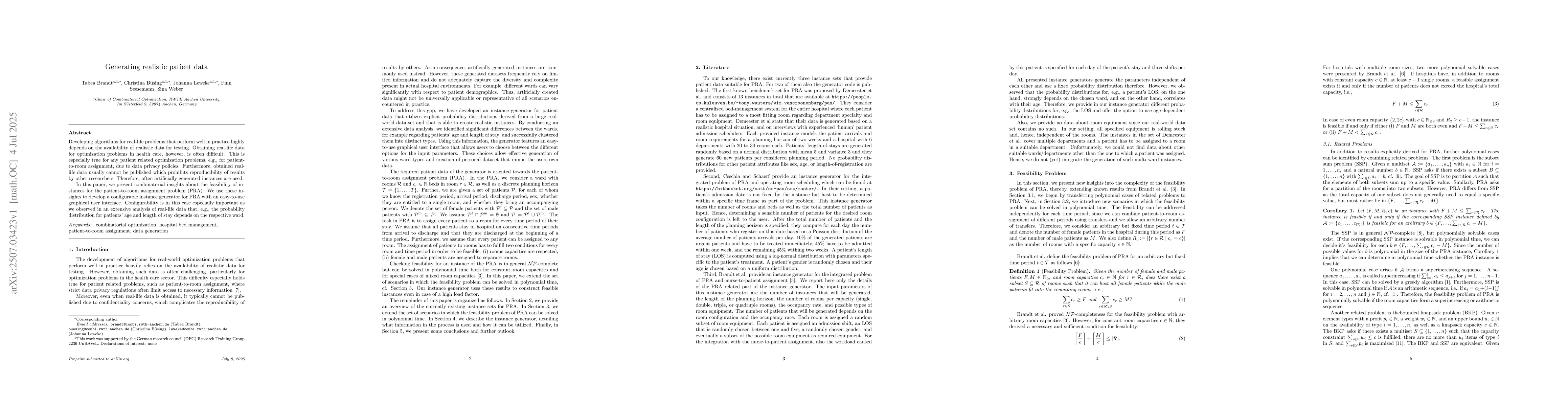 Developing algorithms for real-life problems that perform well in practice highly depends on the availability of realistic data for testing. Obtaining real-life data for optimization problems in health care, however, is often difficult. This is especially true for any patient related optimization problems, e.g., for patient-to-room assignment, due to data privacy policies. Furthermore, obtained real-life data usually cannot be published which prohibits reproducibility of results by other researchers. Therefore, often artificially generated instances are used. In this paper, we present combinatorial insights about the feasibility of instances for the patient-to-room assignment problem (PRA). We use these insights to develop a configurable instance generator for PRA with an easy-to-use graphical user interface. Configurability is in this case especially important as we observed in an extensive analysis of real-life data that, e.g., the probability distribution for patients' age and length of stay depends on the respective ward.