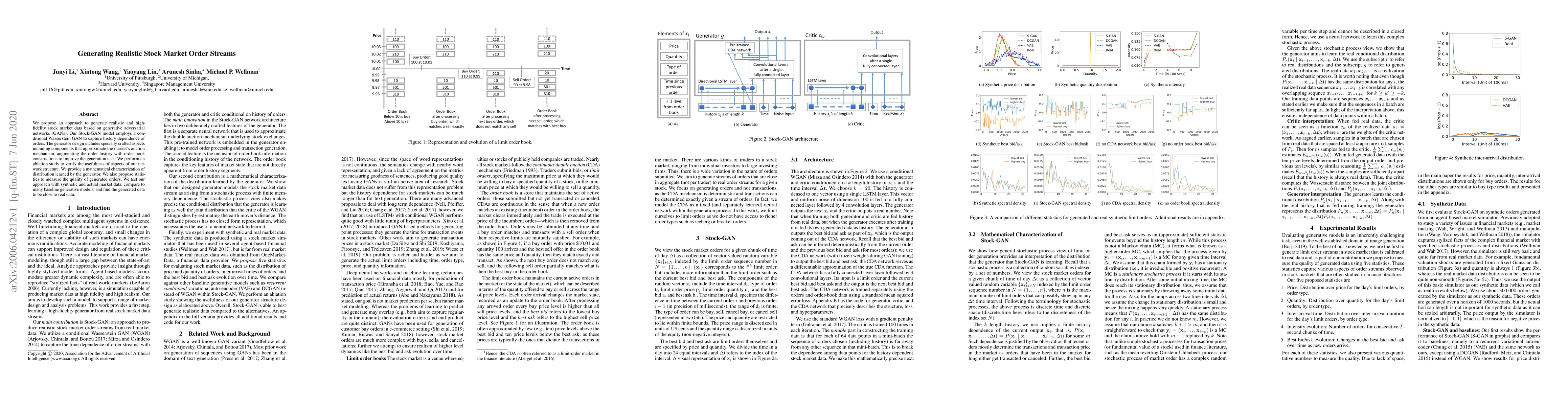 A new approach using generative adversarial networks (GANs) generates realistic stock market data, including history dependence on orders and a mathematically characterized distribution, outperforming baseline models.