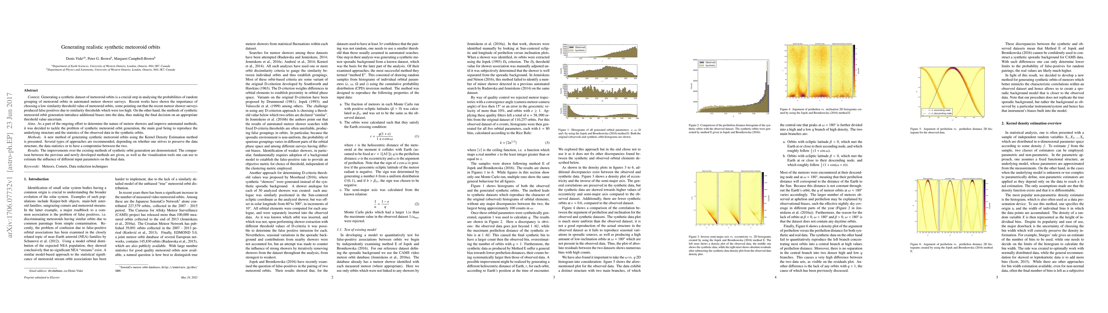 This paper presents a new method for generating synthetic meteoroid orbits using Kernel Density Estimation to better reproduce the observed data's structure and statistics, aiming to improve automated meteor shower surveys and reduce false positives. The new method demonstrates improvements over existing techniques and provides visualization tools to assess parameter influences.