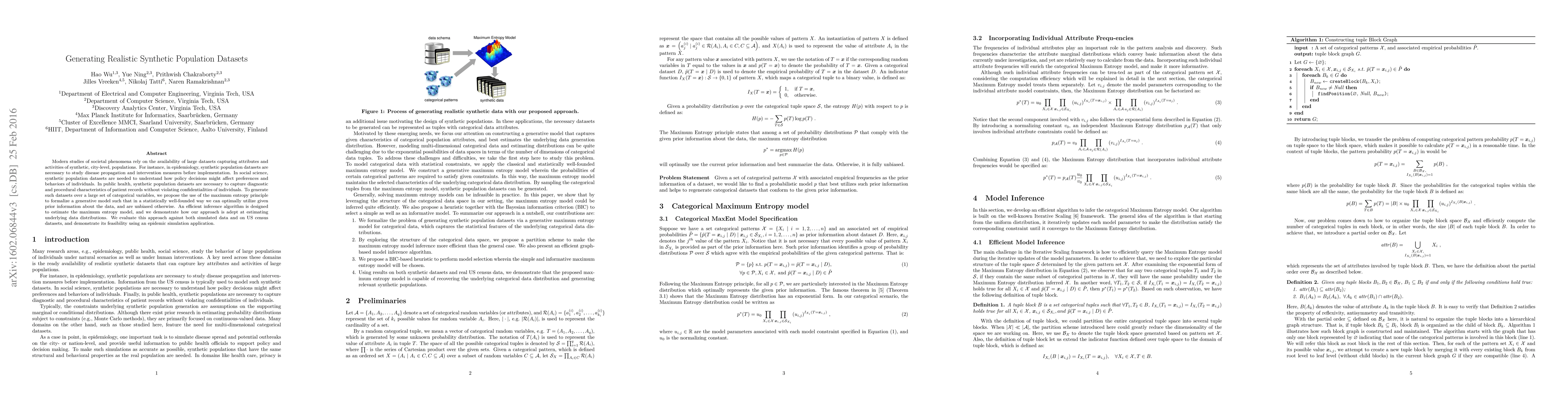 This paper proposes a maximum entropy-based generative model to create realistic synthetic population datasets for societal studies, ensuring unbiased utilization of prior information. The method is evaluated against simulated and US census data and shown to be effective in an epidemic simulation application.