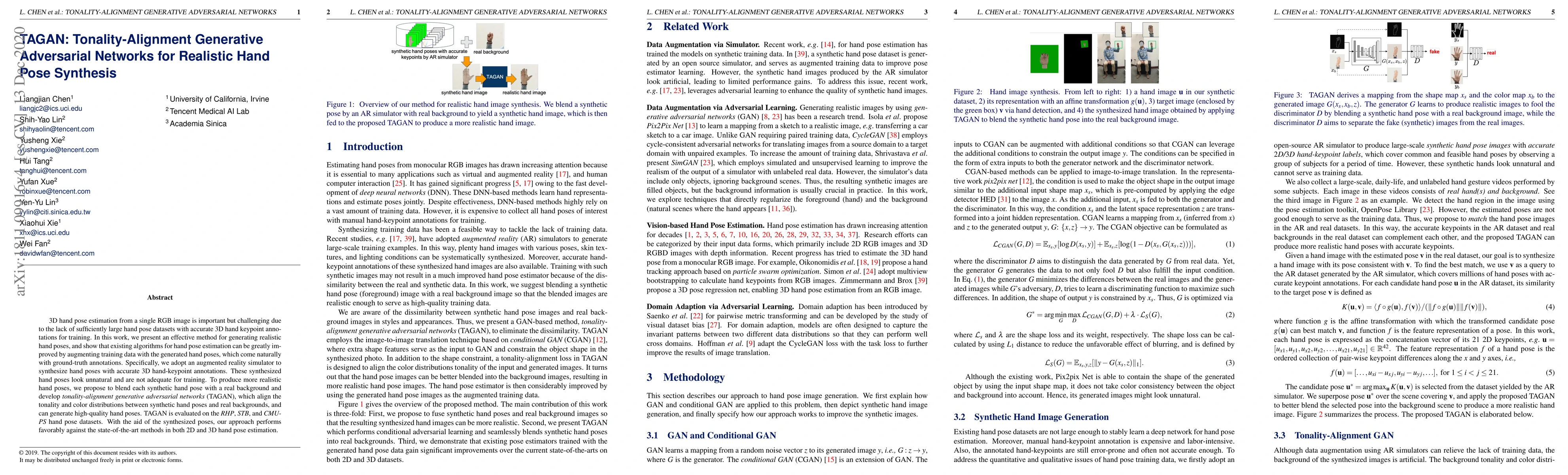 Hand pose estimation from a monocular RGB image is an important but challenging task. The main factor affecting its performance is the lack of a sufficiently large training dataset with accurate hand-keypoint annotations. In this work, we circumvent this problem by proposing an effective method for generating realistic hand poses and show that state-of-the-art algorithms for hand pose estimation can be greatly improved by utilizing the generated hand poses as training data. Specifically, we first adopt an augmented reality (AR) simulator to synthesize hand poses with accurate hand-keypoint labels. Although the synthetic hand poses come with precise joint labels, eliminating the need of manual annotations, they look unnatural and are not the ideal training data. To produce more realistic hand poses, we propose to blend a synthetic hand pose with a real background, such as arms and sleeves. To this end, we develop tonality-alignment generative adversarial networks (TAGANs), which align the tonality and color distributions between synthetic hand poses and real backgrounds, and can generate high quality hand poses. We evaluate TAGAN on three benchmarks, including the RHP, STB, and CMU-PS hand pose datasets. With the aid of the synthesized poses, our method performs favorably against the state-of-the-arts in both 2D and 3D hand pose estimations.