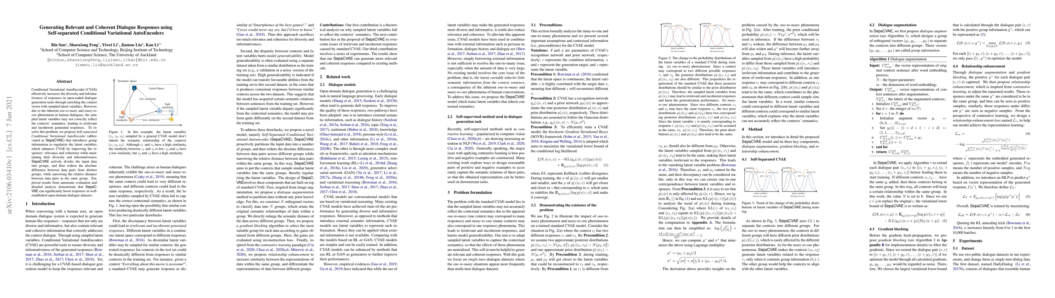 This paper proposes SepaCVAE to enhance the generation of relevant and coherent dialogue responses by using self-separated conditional variational autoencoders that incorporate group information to better reflect context semantics, improving response relevance and coherence while maintaining diversity. Empirical results show significant improvements in open-domain dialogue datasets.