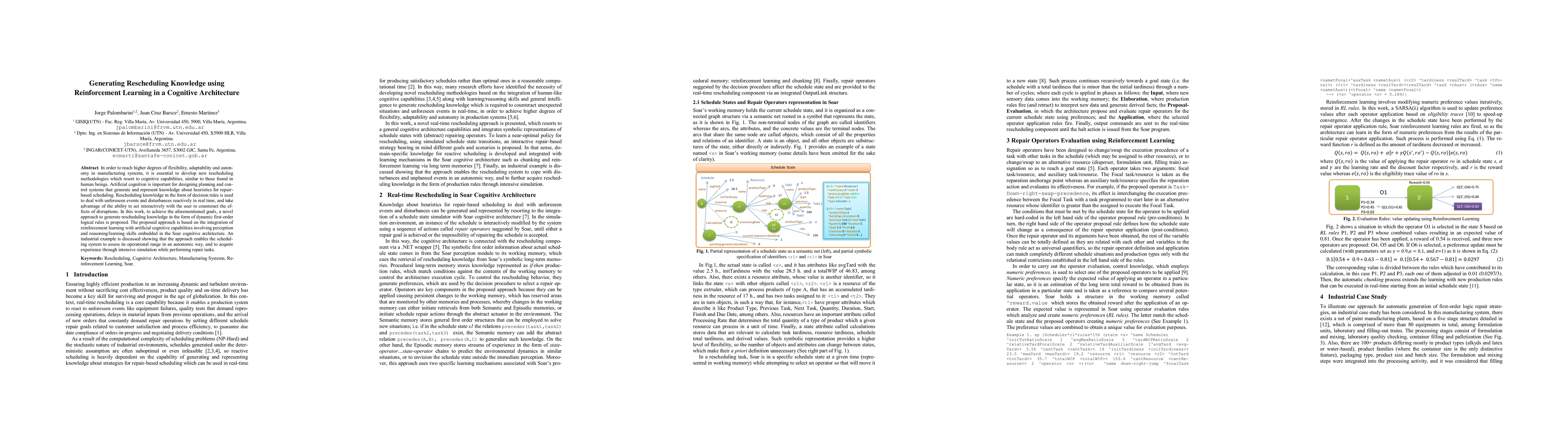 This paper proposes a novel approach to generate rescheduling knowledge using reinforcement learning integrated with the Soar cognitive architecture, aiming to enhance flexibility and adaptability in manufacturing systems by developing dynamic first-order logical rules to handle real-time disturbances and disruptions. The method demonstrates its effectiveness through an industrial example showcasing the system's ability to autonomously assess operational ranges and learn from simulation-based repair tasks.