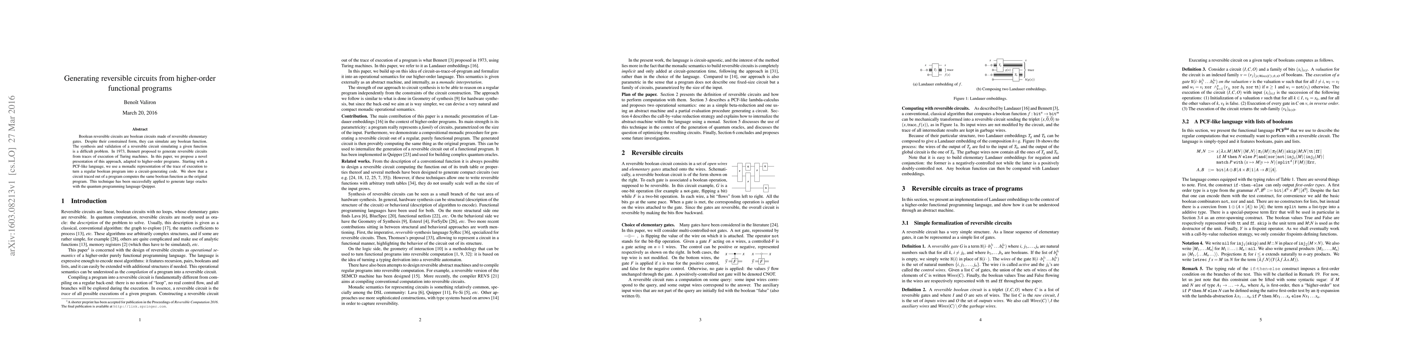 Boolean reversible circuits are boolean circuits made of reversible elementary gates. Despite their constrained form, they can simulate any boolean function. The synthesis and validation of a reversible circuit simulating a given function is a difficult problem. In 1973, Bennett proposed to generate reversible circuits from traces of execution of Turing machines. In this paper, we propose a novel presentation of this approach, adapted to higher-order programs. Starting with a PCF-like language, we use a monadic representation of the trace of execution to turn a regular boolean program into a circuit-generating code. We show that a circuit traced out of a program computes the same boolean function as the original program. This technique has been successfully applied to generate large oracles with the quantum programming language Quipper.