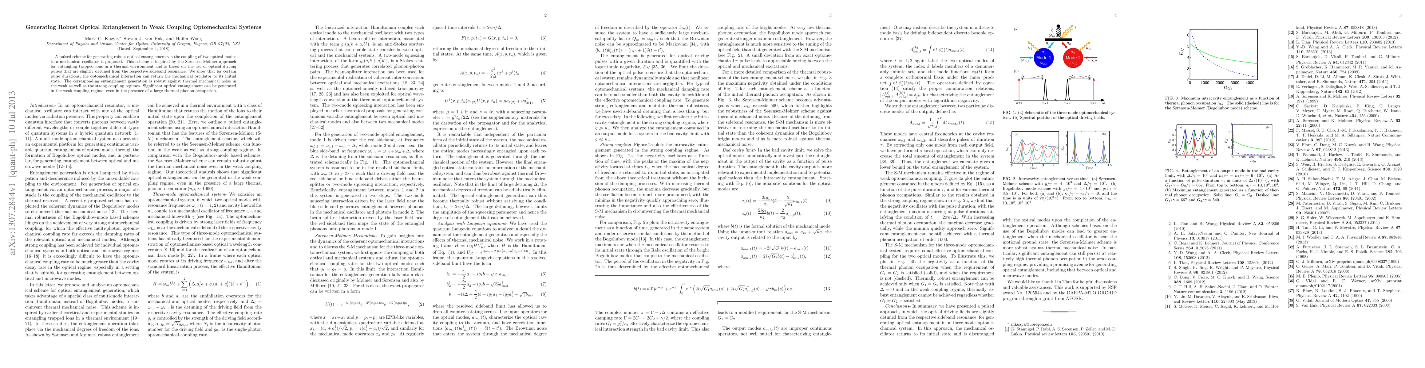 This paper proposes a pulsed scheme for generating robust optical entanglement in optomechanical systems by coupling two optical modes to a mechanical oscillator, inspired by the S{\o}rensen-M{\o}lmer approach. The method is shown to be effective in the weak coupling regime, generating significant entanglement even with high thermal phonon occupation.
