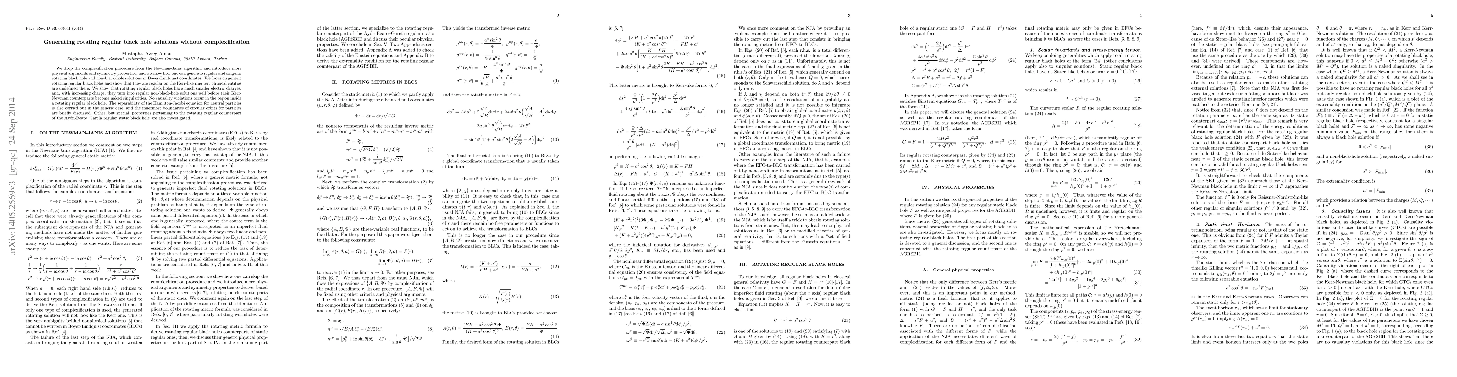 This paper presents a method to generate rotating regular black hole solutions without complexification, showing they are regular except at the Kerr-like ring where physical entities are undefined. It demonstrates that these solutions have smaller electric charges and avoid becoming naked singularities, maintaining causality inside the black hole.
