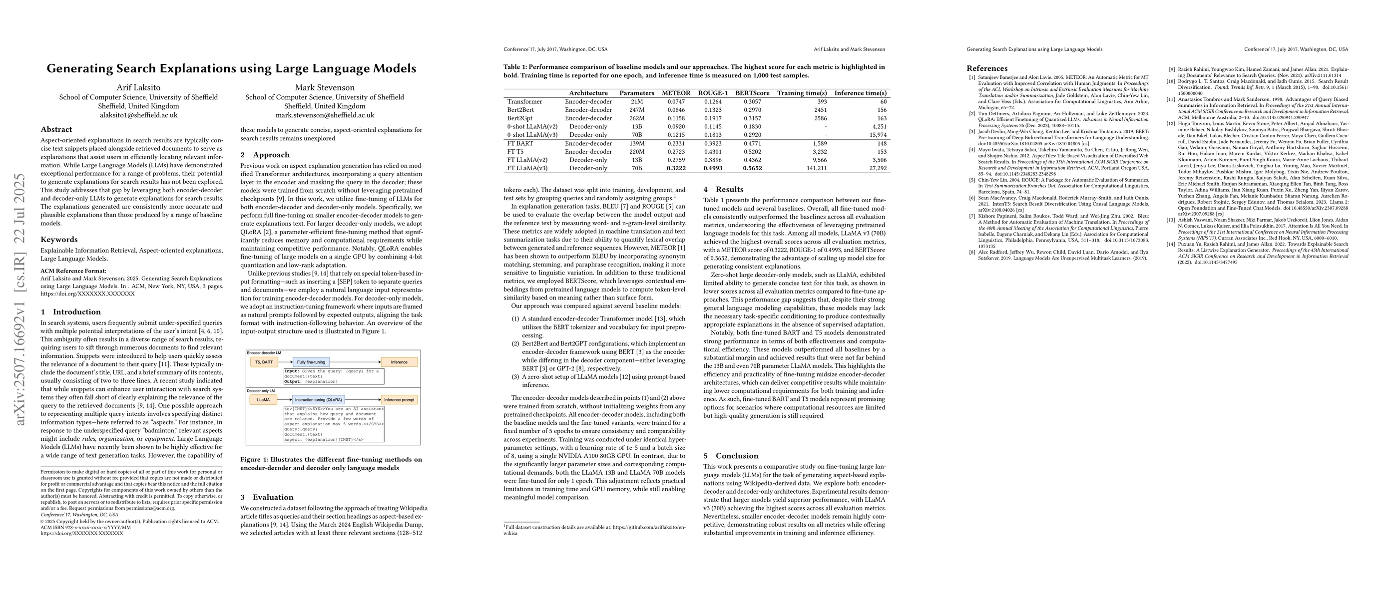 The paper introduces fine-tuning methods for both encoder-decoder and decoder-only LLMs using full-fine-tuning and QLoRA, respectively, for generating aspect-oriented search explanations.