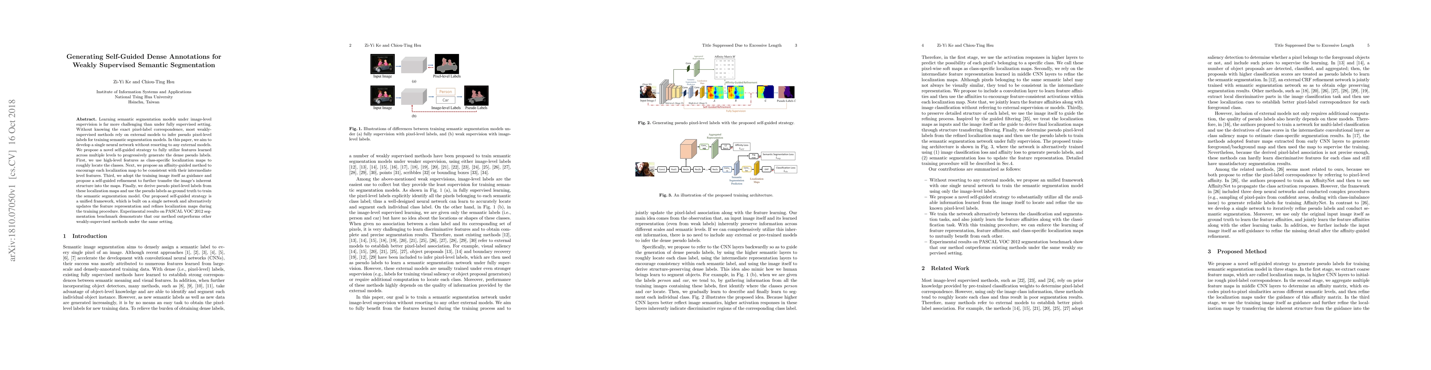 Learning semantic segmentation models under image-level supervision is far more challenging than under fully supervised setting. Without knowing the exact pixel-label correspondence, most weakly-supervised methods rely on external models to infer pseudo pixel-level labels for training semantic segmentation models. In this paper, we aim to develop a single neural network without resorting to any external models. We propose a novel self-guided strategy to fully utilize features learned across multiple levels to progressively generate the dense pseudo labels. First, we use high-level features as class-specific localization maps to roughly locate the classes. Next, we propose an affinity-guided method to encourage each localization map to be consistent with their intermediate level features. Third, we adopt the training image itself as guidance and propose a self-guided refinement to further transfer the image's inherent structure into the maps. Finally, we derive pseudo pixel-level labels from these localization maps and use the pseudo labels as ground truth to train the semantic segmentation model. Our proposed self-guided strategy is a unified framework, which is built on a single network and alternatively updates the feature representation and refines localization maps during the training procedure. Experimental results on PASCAL VOC 2012 segmentation benchmark demonstrate that our method outperforms other weakly-supervised methods under the same setting.