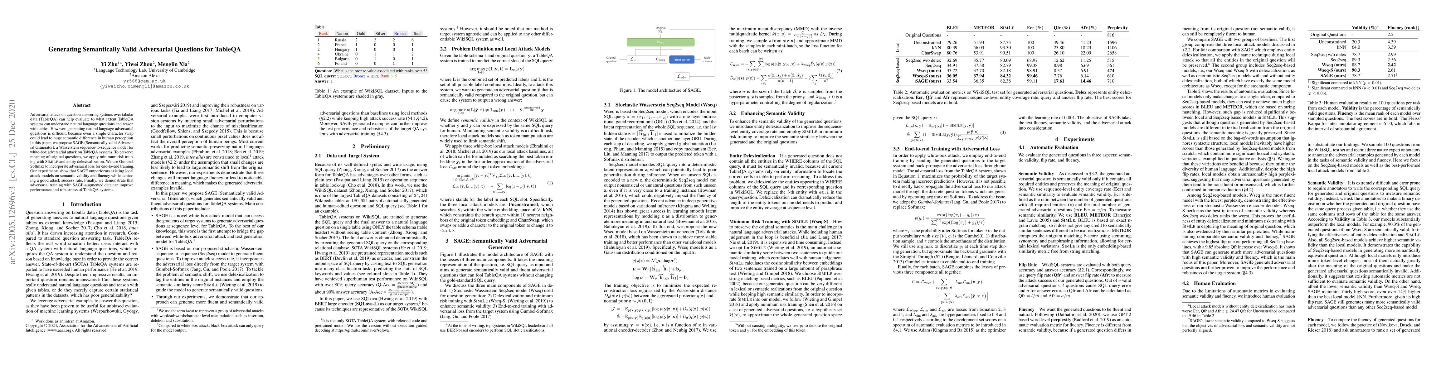 This paper introduces SAGE, a Wasserstein sequence-to-sequence model for generating semantically valid adversarial questions for TableQA systems, using minimum risk training and Gumbel-Softmax for adversarial loss. Experiments show SAGE outperforms existing models in semantic validity and fluency while enhancing TableQA robustness through adversarial training.