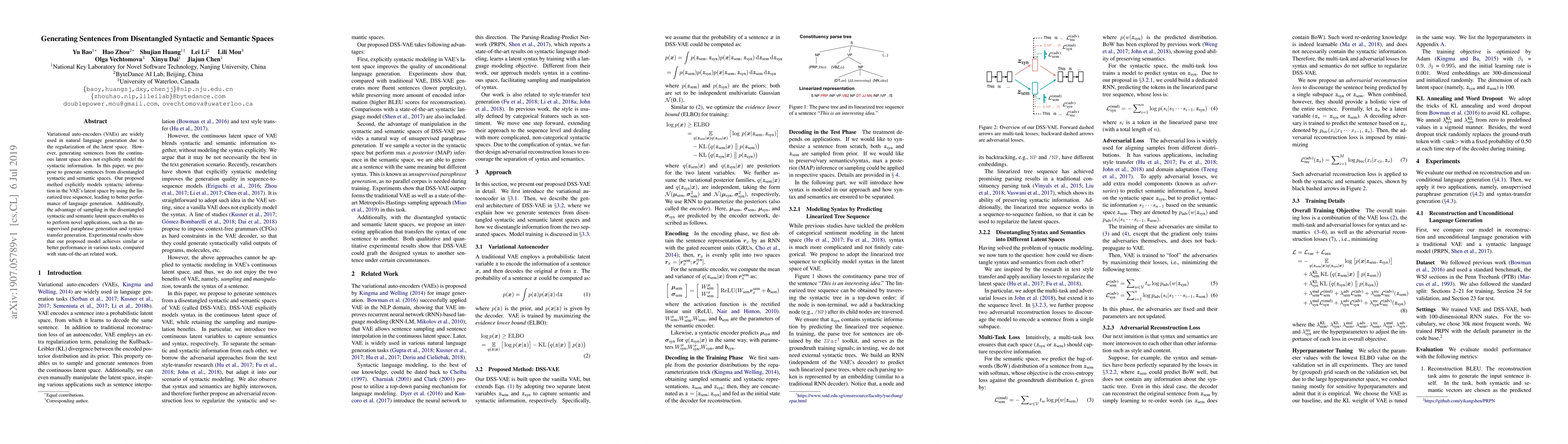 This paper proposes a method to generate sentences by explicitly modeling syntactic information within a disentangled latent space of a variational auto-encoder, improving language generation tasks. The model achieves better performance and enables applications like unsupervised paraphrase and syntax-transfer generation.