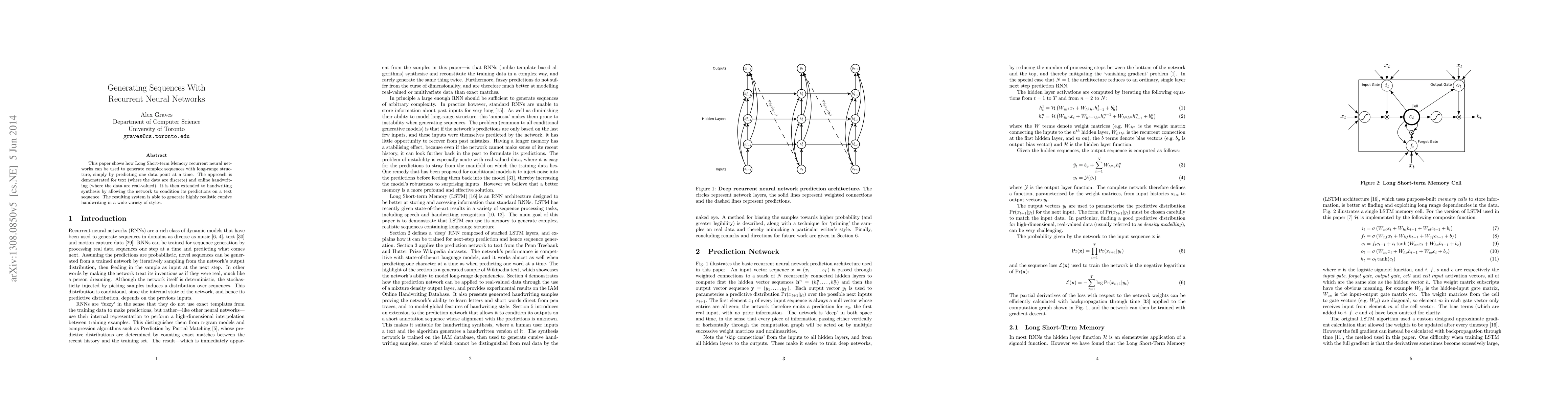 This paper shows how Long Short-term Memory recurrent neural networks can be used to generate complex sequences with long-range structure, simply by predicting one data point at a time. The approach is demonstrated for text (where the data are discrete) and online handwriting (where the data are real-valued). It is then extended to handwriting synthesis by allowing the network to condition its predictions on a text sequence. The resulting system is able to generate highly realistic cursive handwriting in a wide variety of styles.