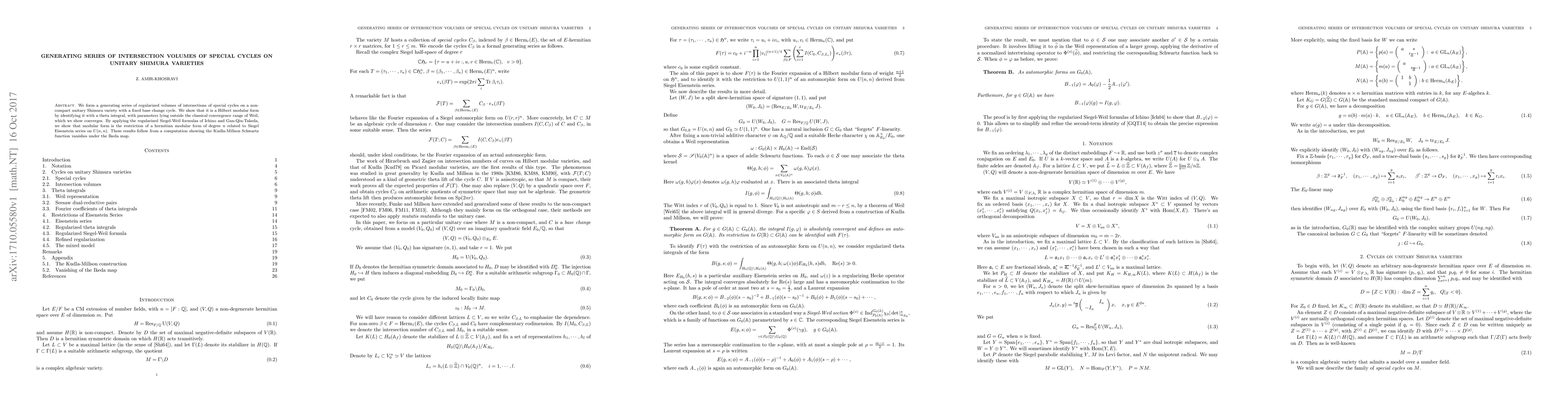 Researchers develop a generating series for intersection volumes of special cycles on unitary Shimura varieties, linking it to theta integrals and Siegel Eisenstein series, with implications for modular forms and convergence.