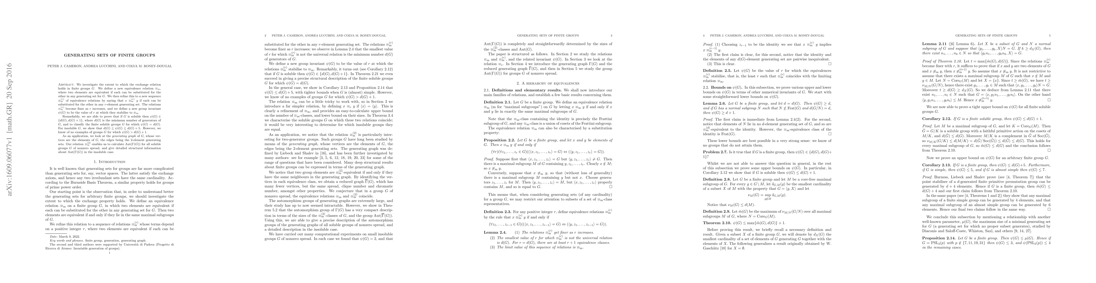 We investigate the extent to which the exchange relation holds in finite groups $G$. We define a new equivalence relation $\equiv_{\mathrm{m}}$, where two elements are equivalent if each can be substituted for the other in any generating set for $G$. We then refine this to a new sequence $\equiv_{\mathrm{m}}^{(r)}$ of equivalence relations by saying that $x \equiv_{\mathrm{m}}^{(r)}y$ if each can be substituted for the other in any $r$-element generating set. The relations $\equiv_{\mathrm{m}}^{(r)}$ become finer as $r$ increases, and we define a new group invariant $\psi(G)$ to be the value of $r$ at which they stabilise to $\equiv_{\mathrm{m}}$. Remarkably, we are able to prove that if $G$ is soluble then $\psi(G) \in \{d(G), d(G) +1\}$, where $d(G)$ is the minimum number of generators of $G$, and to classify the finite soluble groups $G$ for which $\psi(G) = d(G)$. For insoluble $G$, we show that $d(G) \leq \psi(G) \leq d(G) + 5$. However, we know of no examples of groups $G$ for which $\psi(G) > d(G) + 1$. As an application, we look at the generating graph of $G$, whose vertices are the elements of $G$, the edges being the $2$-element generating sets. Our relation $\equiv_{\mathrm{m}}^{(2)}$ enables us to calculate $\mathrm{Aut}(\Gamma(G))$ for all soluble groups $G$ of nonzero spread, and give detailed structural information about $\mathrm{Aut}(\Gamma(G))$ in the insoluble case.