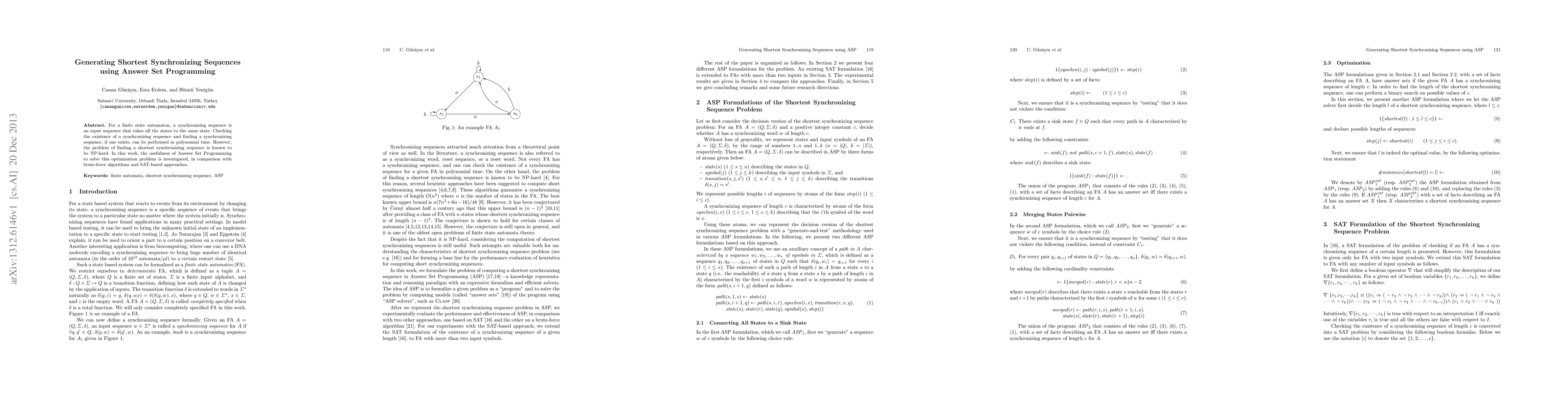 This paper investigates using Answer Set Programming (ASP) to find the shortest synchronizing sequence for finite state automata, comparing its effectiveness to brute-force algorithms and SAT-based approaches. The problem of finding such sequences is known to be NP-hard.