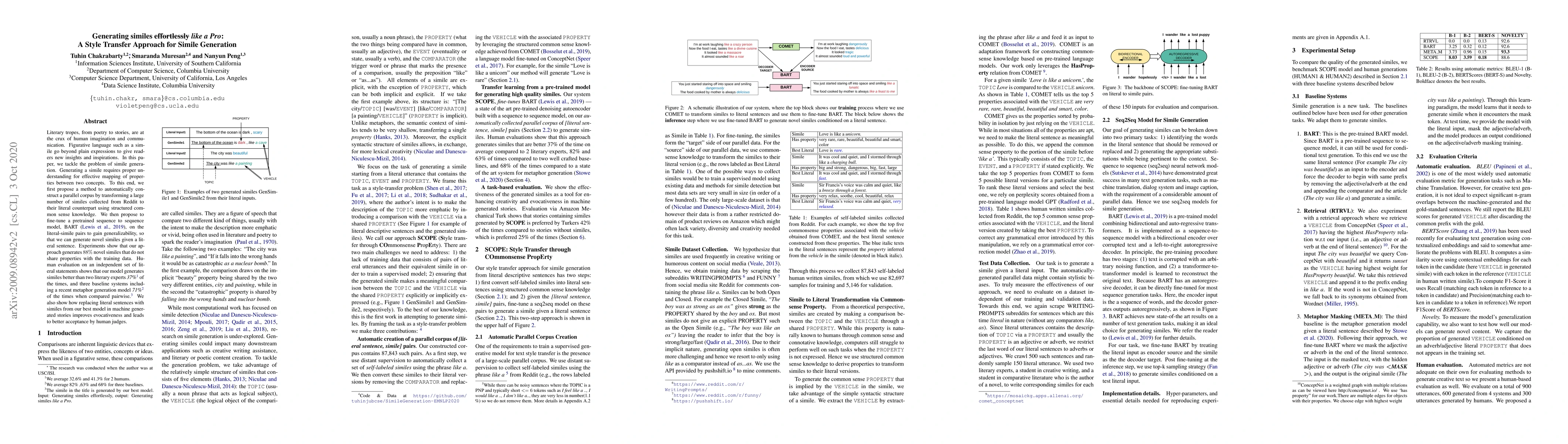 Literary tropes, from poetry to stories, are at the crux of human imagination and communication. Figurative language such as a simile go beyond plain expressions to give readers new insights and inspirations. In this paper, we tackle the problem of simile generation. Generating a simile requires proper understanding for effective mapping of properties between two concepts. To this end, we first propose a method to automatically construct a parallel corpus by transforming a large number of similes collected from Reddit to their literal counterpart using structured common sense knowledge. We then propose to fine-tune a pretrained sequence to sequence model, BART~\cite{lewis2019bart}, on the literal-simile pairs to gain generalizability, so that we can generate novel similes given a literal sentence. Experiments show that our approach generates $88\%$ novel similes that do not share properties with the training data. Human evaluation on an independent set of literal statements shows that our model generates similes better than two literary experts \textit{37\%}\footnote{We average 32.6\% and 41.3\% for 2 humans.} of the times, and three baseline systems including a recent metaphor generation model \textit{71\%}\footnote{We average 82\% ,63\% and 68\% for three baselines.} of the times when compared pairwise.\footnote{The simile in the title is generated by our best model. Input: Generating similes effortlessly, output: Generating similes \textit{like a Pro}.} We also show how replacing literal sentences with similes from our best model in machine generated stories improves evocativeness and leads to better acceptance by human judges.