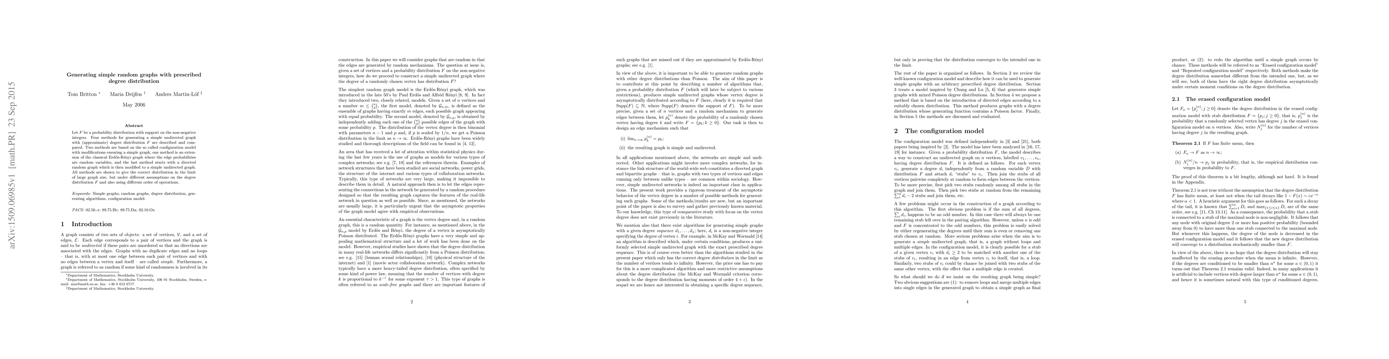 This paper presents four methods to generate simple random graphs with a specified degree distribution F, all proven to yield the correct distribution as graph size increases. Methods include modifications of the configuration model, an Erdős-Rényi graph with random edge probabilities, and a directed-to-undirected conversion. Each method has unique assumptions and operational orders.