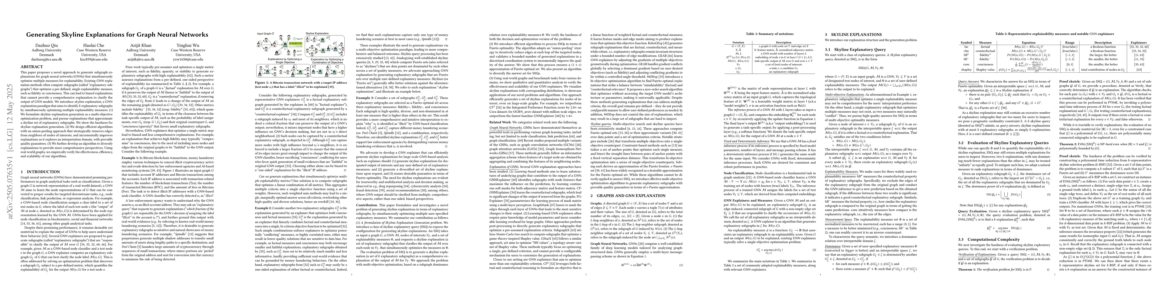 This paper introduces a new approach to explain graph neural networks (GNNs) called skyline explanation, which generates multiple subgraphs that optimize multiple measures for explainability, providing more comprehensive explanations.