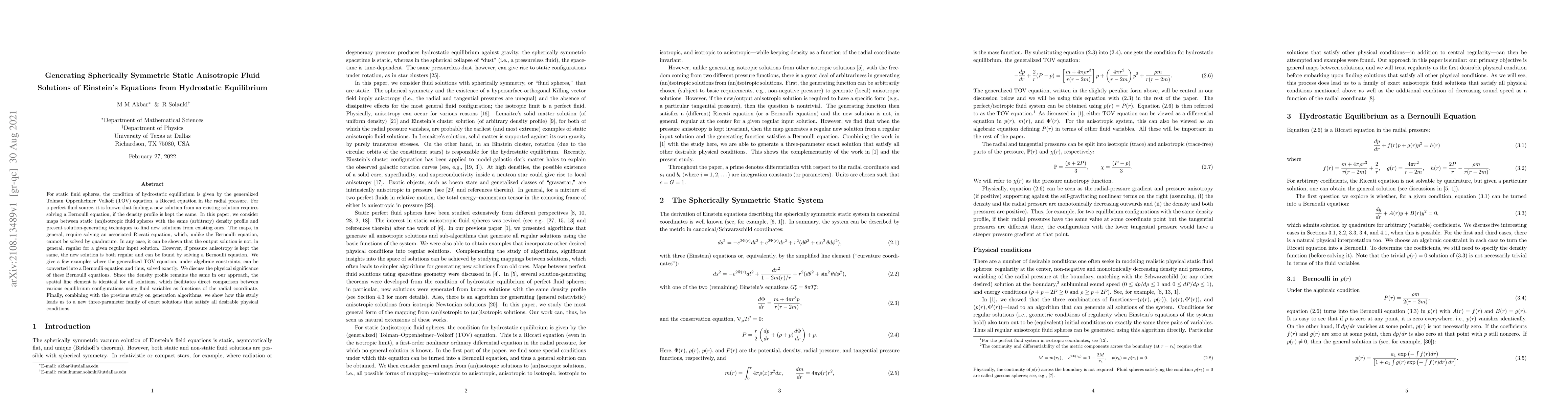 For static fluid spheres, the condition of hydrostatic equilibrium is given by the generalized Tolman--Oppenheimer--Volkoff (TOV) equation, a Riccati equation in the radial pressure. For a perfect fluid source, it is known that finding a new solution from an existing solution requires solving a Bernoulli equation, if the density profile is kept the same. In this paper, we consider maps between static (an)isotropic fluid spheres with the same (arbitrary) density profile and present solution-generating techniques to find new solutions from existing ones. The maps, in general, require solving an associated Riccati equation, which, unlike the Bernoulli equation, cannot be solved by quadrature. In any case, it can be shown that the output solution is not, in general, regular for a given regular input solution. However, if pressure anisotropy is kept the same, the new solution is both regular and can be found by solving a Bernoulli equation. We give a few examples where the generalized TOV equation, under algebraic constraints, can be converted into a Bernoulli equation and thus, solved exactly. We discuss the physical significance of these Bernoulli equations. Since the density profile remains the same in our approach, the spatial line element is identical for all solutions, which facilitates direct comparison between various equilibrium configurations using fluid variables as functions of the radial coordinate. Finally, combining with the previous study on generation algorithms, we show how this study leads us to a new three-parameter family of exact solutions that satisfy all desirable physical conditions.