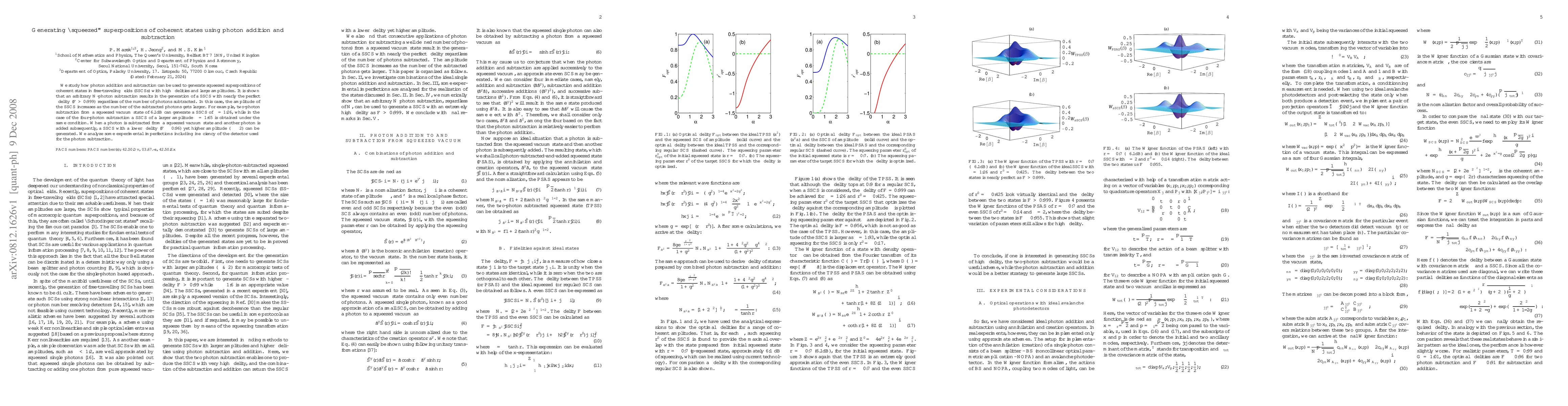 This paper investigates the generation of squeezed superpositions of coherent states (SSCSs) via photon addition and subtraction, achieving high fidelity and large amplitudes. The study demonstrates that $N$-photon subtraction can yield SSCSs with nearly perfect fidelity ($F>0.999$), with increasing amplitude as more photons are subtracted.