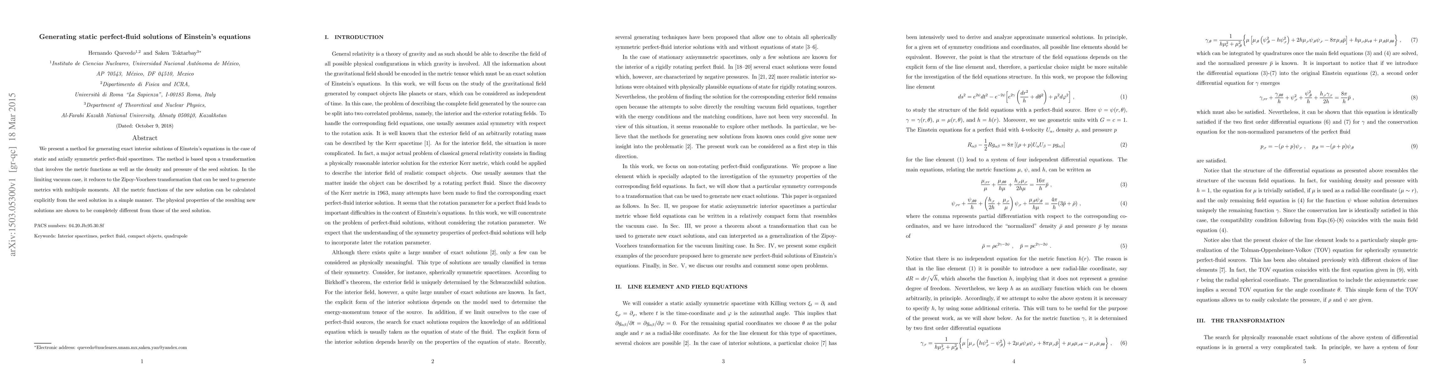 The research presents a method for generating exact interior solutions of Einstein's equations for static and axially symmetric perfect-fluid spacetimes, based on a transformation involving metric functions and fluid density/pressure, reducing to the Zipoy-Voorhees transformation in the vacuum case.
