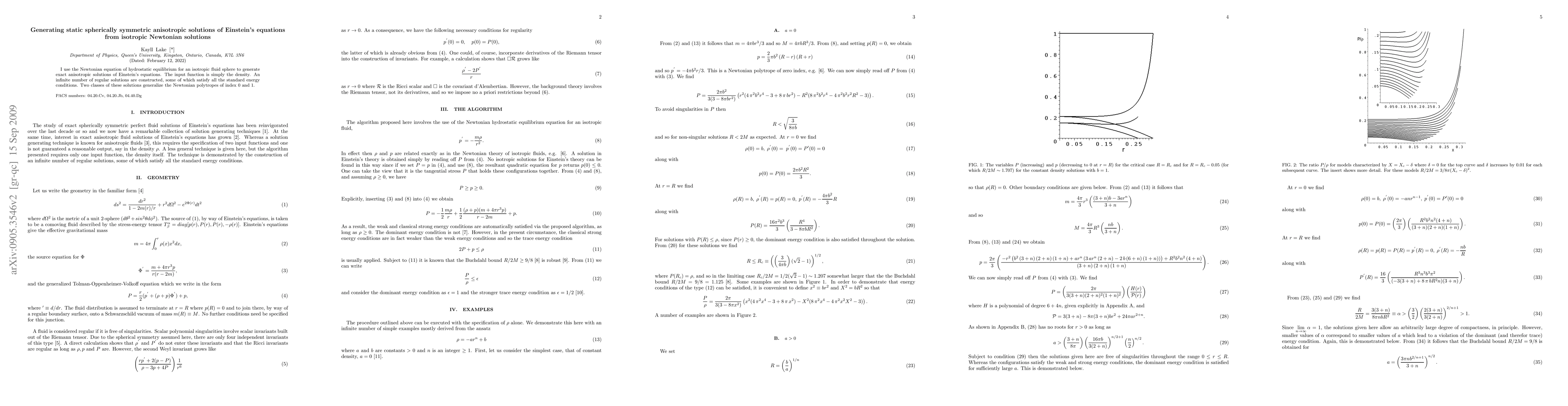 This paper presents a method to derive exact anisotropic solutions of Einstein's equations from isotropic Newtonian solutions, using the hydrostatic equilibrium equation for fluid spheres. The generated solutions, some of which meet standard energy conditions, generalize Newtonian polytropes of indices 0 and 1.