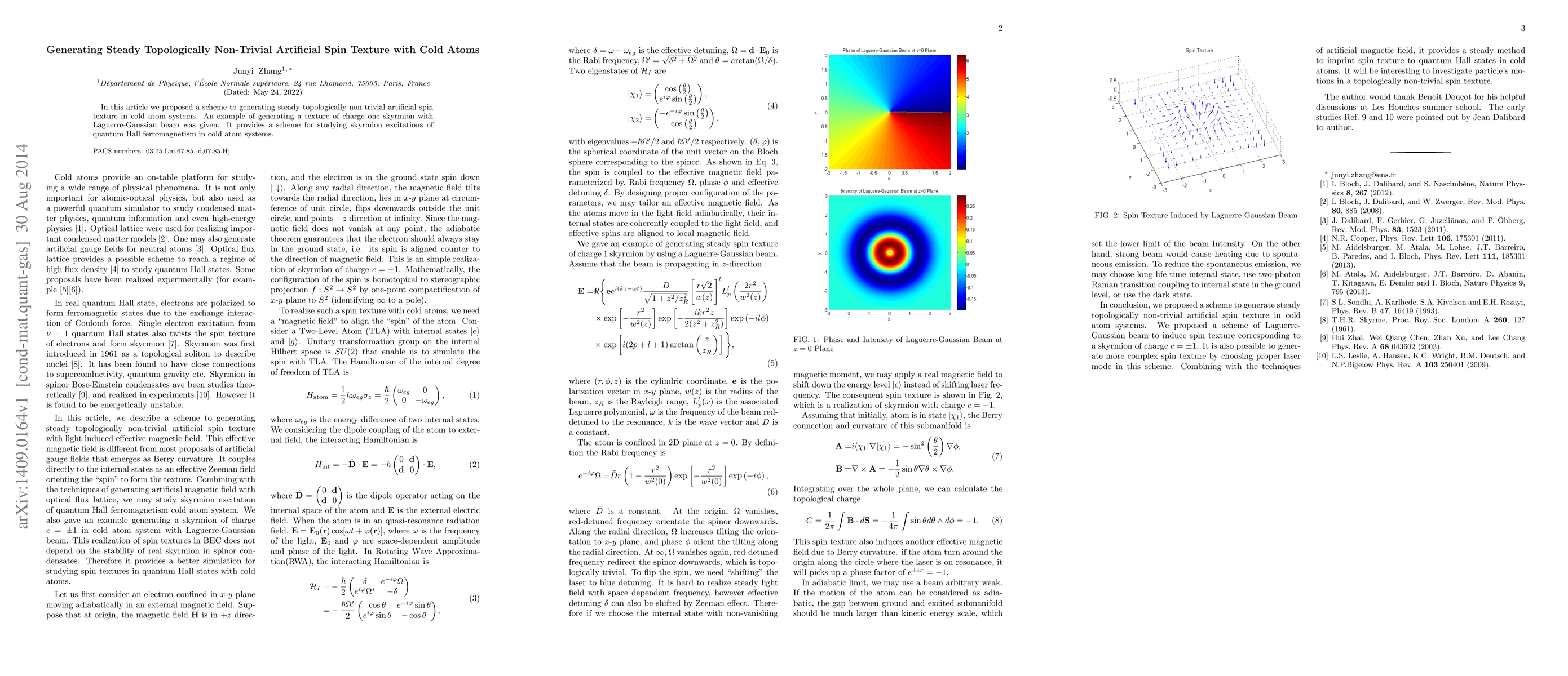 Summary: This paper proposes a method to create steady topologically non-trivial spin textures in cold atom systems, exemplified by generating a charge one skyrmion using a Laguerre-Gaussian beam, facilitating the study of quantum Hall ferromagnetism skyrmion excitations.