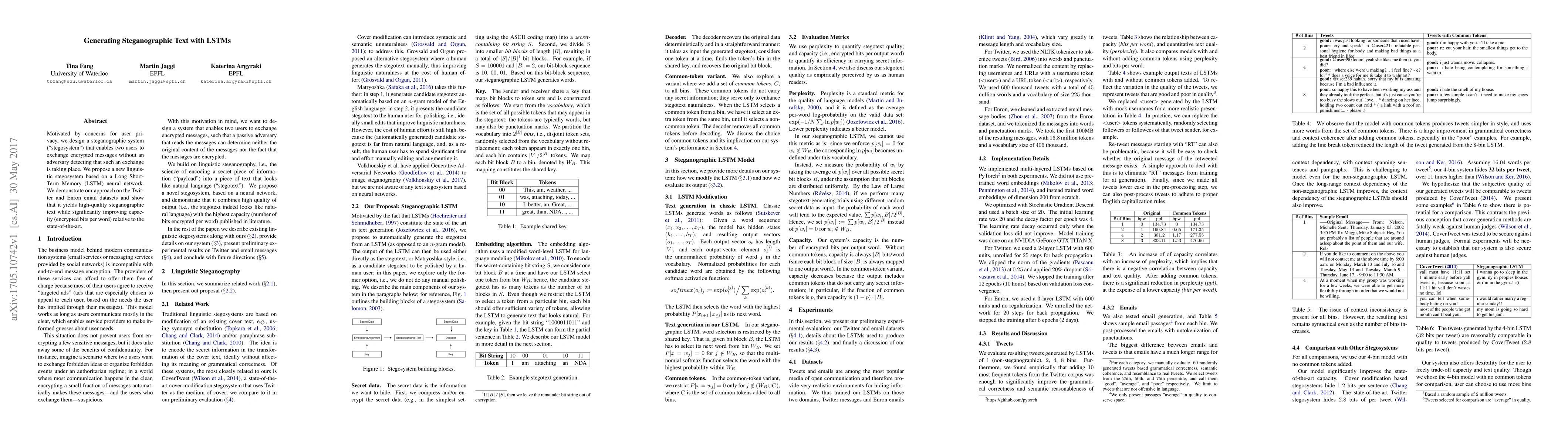 This research proposes a steganographic system using LSTM neural networks to hide encrypted messages in text, demonstrating high-quality results and improved capacity over existing methods, tested on Twitter and Enron email datasets.