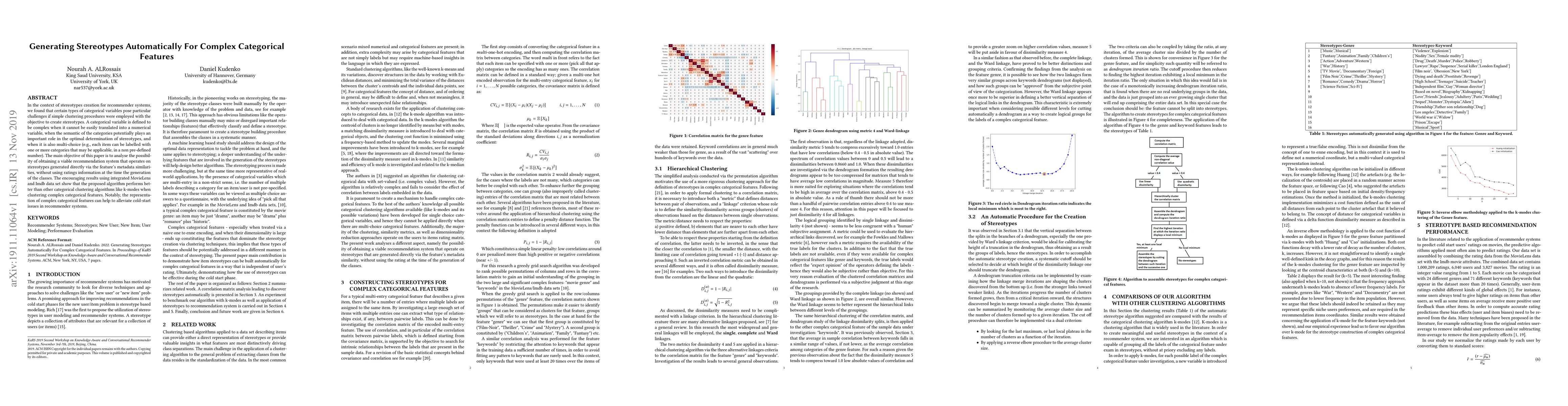 This paper explores generating stereotypes for complex categorical features in recommender systems without relying on ratings, focusing on metadata similarities. The proposed algorithm outperforms k-modes in clustering complex categories, demonstrating potential to mitigate cold-start issues.