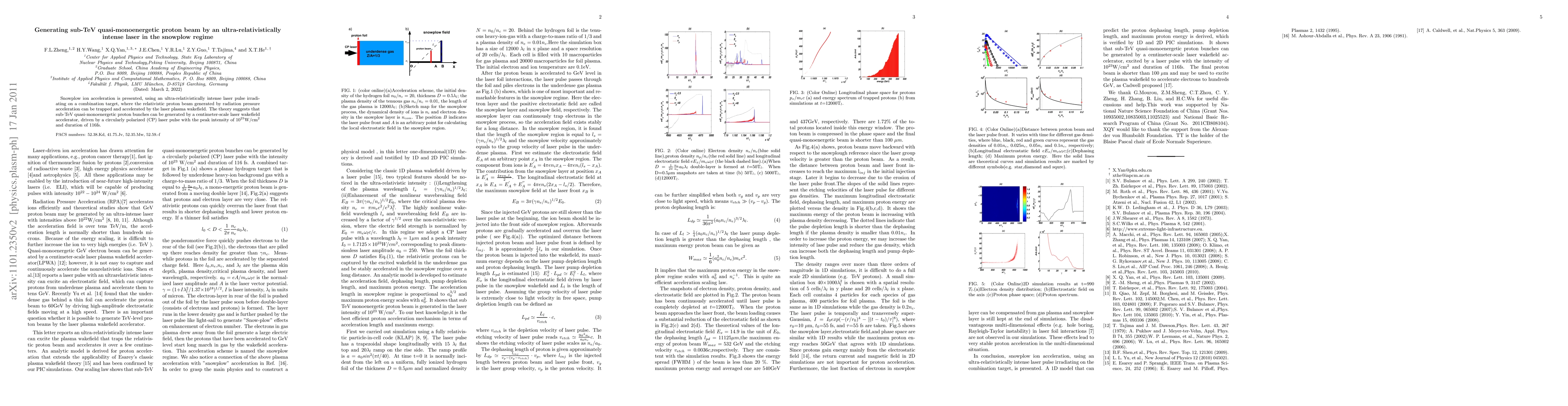 This research demonstrates the generation of sub-TeV quasi-monoenergetic proton beams via snowplow ion acceleration using an ultra-relativistically intense laser pulse. The study proposes that a centimeter-scale laser wakefield accelerator driven by a circularly polarized laser with a peak intensity of 10^23W/cm^2 can achieve this.