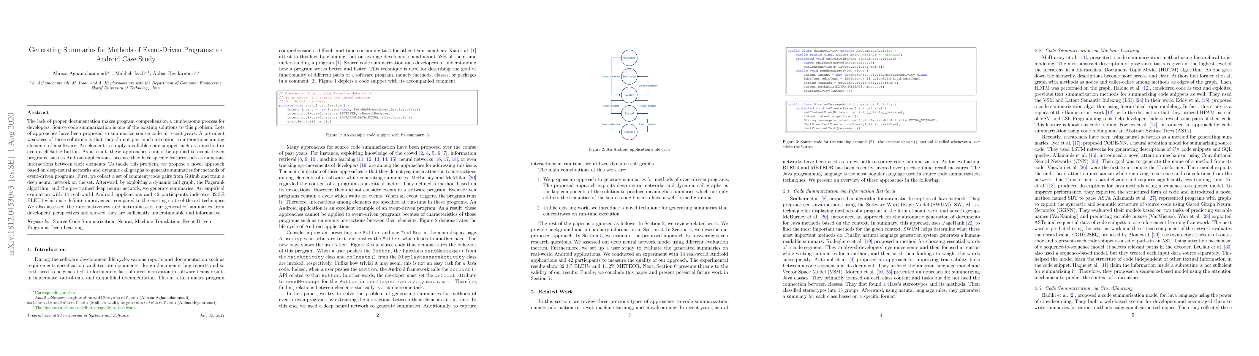The lack of proper documentation makes program comprehension a cumbersome process for developers. Source code summarization is one of the existing solutions to this problem. Lots of approaches have been proposed to summarize source code in recent years. A prevalent weakness of these solutions is that they do not pay much attention to interactions among elements of a software. An element is simply a callable code snippet such as a method or even a clickable button. As a result, these approaches cannot be applied to event-driven programs, such as Android applications, because they have specific features such as numerous interactions between their elements. To tackle this problem, we propose a novel approach based on deep neural networks and dynamic call graphs to generate summaries for methods of event-driven programs. First, we collect a set of comment/code pairs from Github and train a deep neural network on the set. Afterward, by exploiting a dynamic call graph, the Pagerank algorithm, and the pre-trained deep neural network, we generate summaries. An empirical evaluation with 14 real-world Android applications and 42 participants indicates 32.3% BLEU4 which is a definite improvement compared to the existing state-of-the-art techniques. We also assessed the informativeness and naturalness of our generated summaries from developers' perspectives and showed they are sufficiently understandable and informative.