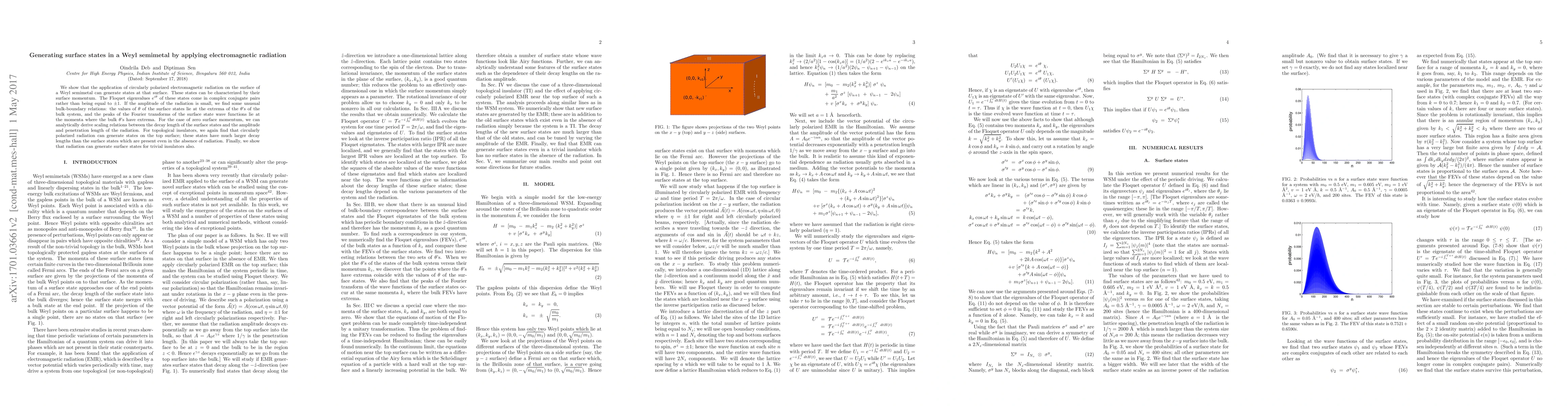 We show that the application of circularly polarized electromagnetic radiation on the surface of a Weyl semi-metal can generate states at that surface. These states can be characterized by their surface momentum. The Floquet eigenvalues of these states come in complex conjugate pairs rather than being equal to $\pm 1$. If the amplitude of the radiation is small, we find some unusual bulk-boundary relations: the Floquet eigenvalues of the surface states lie at the extrema of the Floquet eigenvalues of the bulk system, and the peaks of the Fourier transforms of the surface state wave functions lie at the momenta where the bulk Floquet eigenvalues have extrema. For the case of zero surface momentum, we can analytically derive scaling relations between the decay length of the surface states and the amplitude and penetration length of the radiation. For topological insulators, we again find that circularly polarized radiation can generate states on the surfaces; these states have much larger decay lengths than the surface states which are present even in the absence of radiation. Finally, we show that radiation can generate surface states for trivial insulators also.