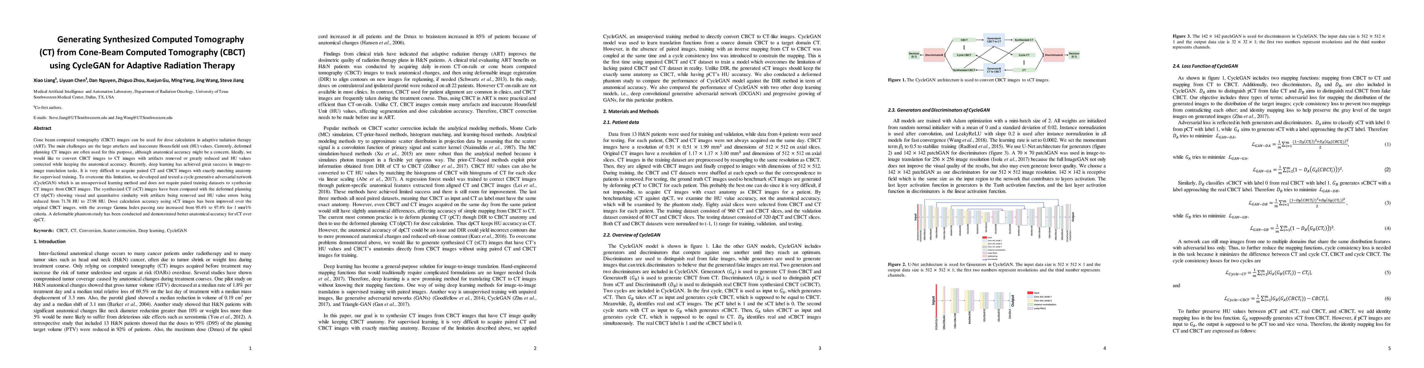 A new method using CycleGAN generates synthesized CT images from CBCT images with reduced artifacts and improved HU values, leading to increased accuracy in dose calculation for adaptive radiation therapy.