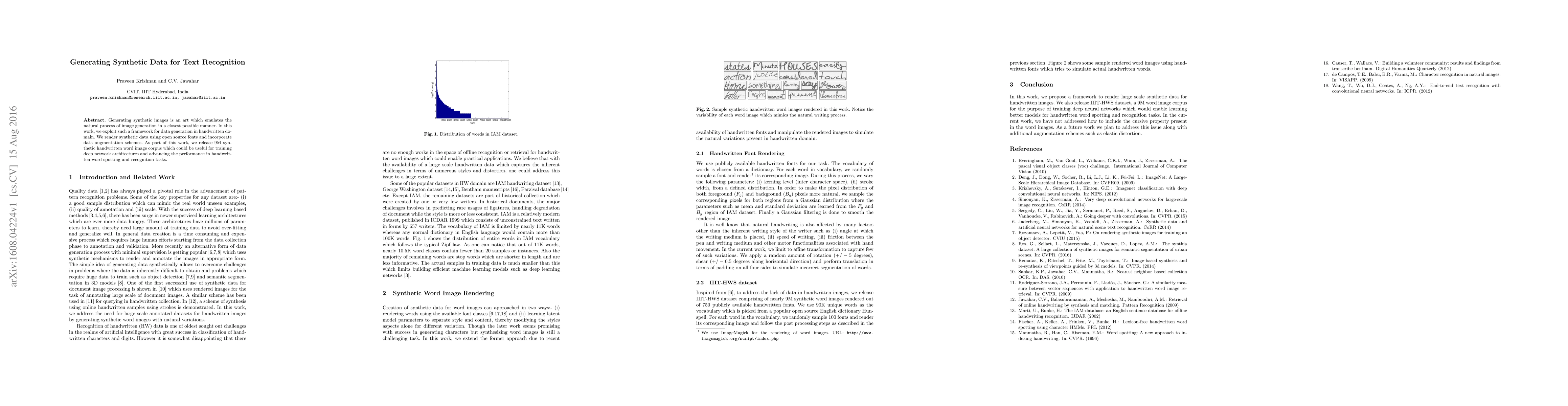This paper develops a synthetic data generation framework for handwritten text using open source fonts and data augmentation, releasing a 9M synthetic word image corpus to enhance deep learning models for handwritten word recognition and spotting.
