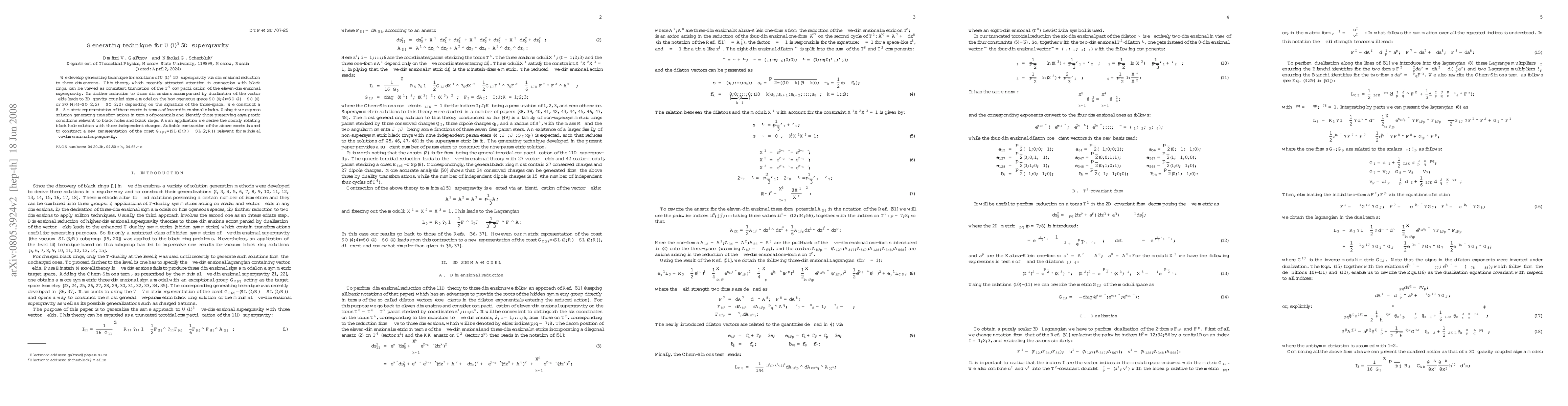 This paper develops a generating technique for solutions of $U(1)^3 5D$ supergravity through dimensional reduction to three dimensions, focusing on the theory's relevance to black rings and deriving a doubly rotating black hole solution with three independent charges. The method involves dualization and matrix representation of cosets to identify transformations preserving asymptotic conditions.