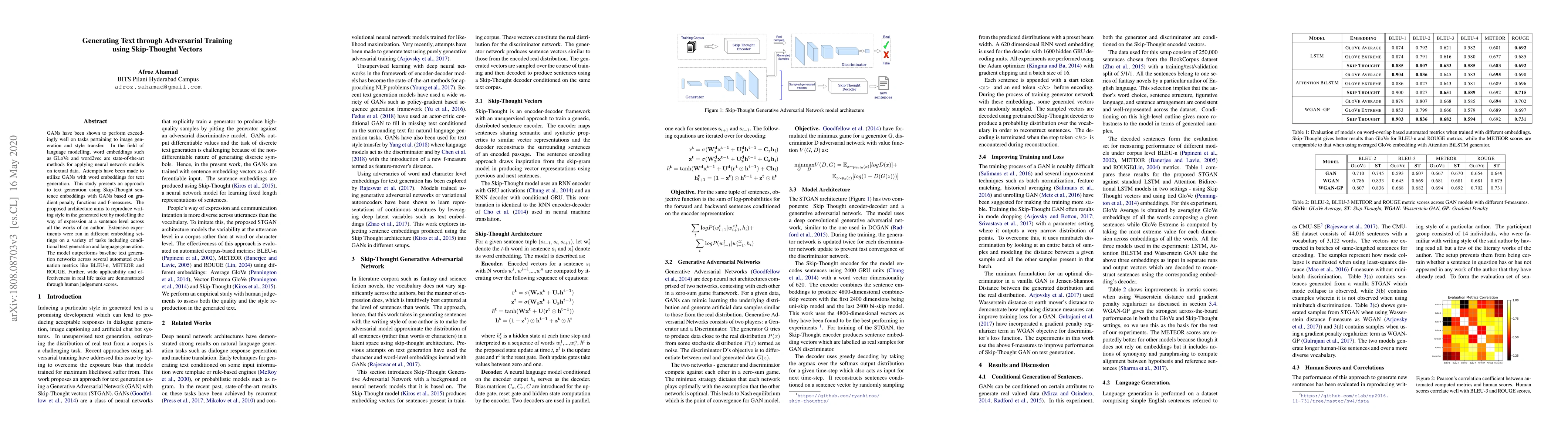 GANs have been shown to perform exceedingly well on tasks pertaining to image generation and style transfer. In the field of language modelling, word embeddings such as GLoVe and word2vec are state-of-the-art methods for applying neural network models on textual data. Attempts have been made to utilize GANs with word embeddings for text generation. This study presents an approach to text generation using Skip-Thought sentence embeddings with GANs based on gradient penalty functions and f-measures. The proposed architecture aims to reproduce writing style in the generated text by modelling the way of expression at a sentence level across all the works of an author. Extensive experiments were run in different embedding settings on a variety of tasks including conditional text generation and language generation. The model outperforms baseline text generation networks across several automated evaluation metrics like BLEU-n, METEOR and ROUGE. Further, wide applicability and effectiveness in real life tasks are demonstrated through human judgement scores.