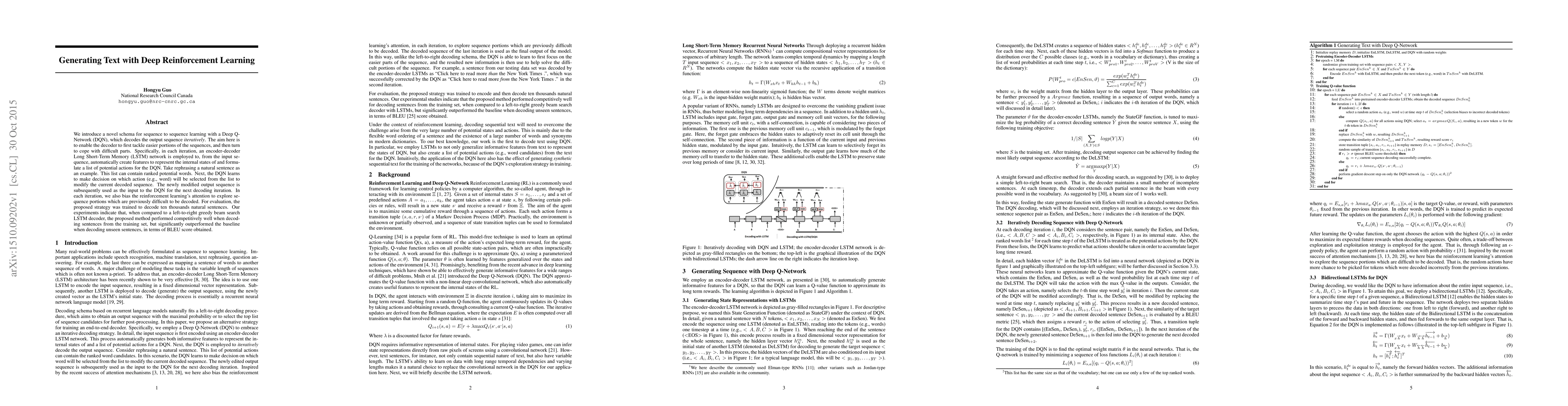 We introduce a novel schema for sequence to sequence learning with a Deep Q-Network (DQN), which decodes the output sequence iteratively. The aim here is to enable the decoder to first tackle easier portions of the sequences, and then turn to cope with difficult parts. Specifically, in each iteration, an encoder-decoder Long Short-Term Memory (LSTM) network is employed to, from the input sequence, automatically create features to represent the internal states of and formulate a list of potential actions for the DQN. Take rephrasing a natural sentence as an example. This list can contain ranked potential words. Next, the DQN learns to make decision on which action (e.g., word) will be selected from the list to modify the current decoded sequence. The newly modified output sequence is subsequently used as the input to the DQN for the next decoding iteration. In each iteration, we also bias the reinforcement learning's attention to explore sequence portions which are previously difficult to be decoded. For evaluation, the proposed strategy was trained to decode ten thousands natural sentences. Our experiments indicate that, when compared to a left-to-right greedy beam search LSTM decoder, the proposed method performed competitively well when decoding sentences from the training set, but significantly outperformed the baseline when decoding unseen sentences, in terms of BLEU score obtained.