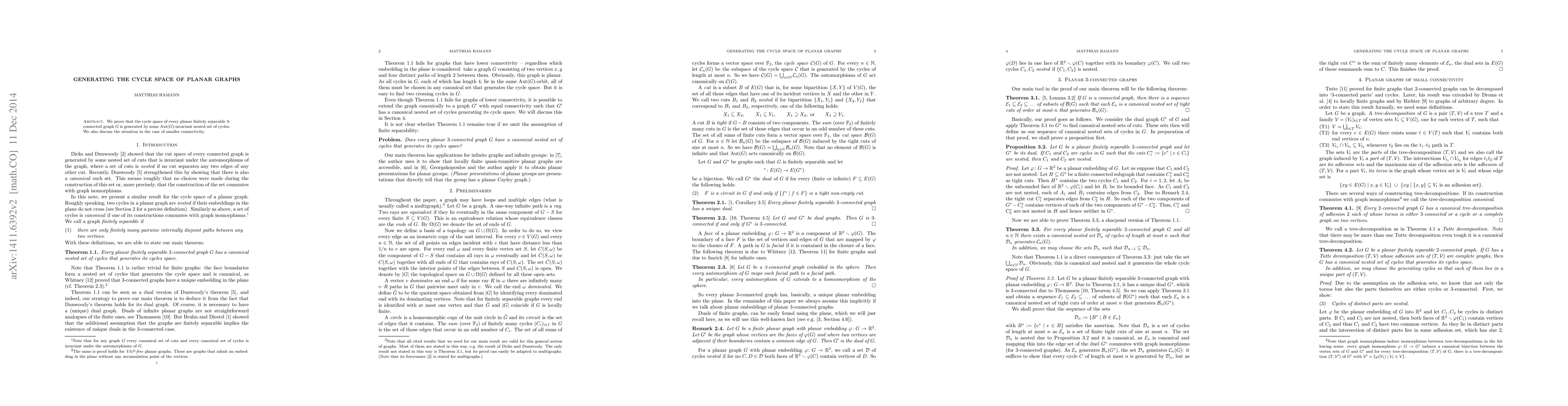 We prove that the cycle space of every planar finitely separable 3-connected graph $G$ is generated by some ${\rm Aut}(G)$-invariant nested set of cycles. We also discuss the situation in the case of smaller connectivity.