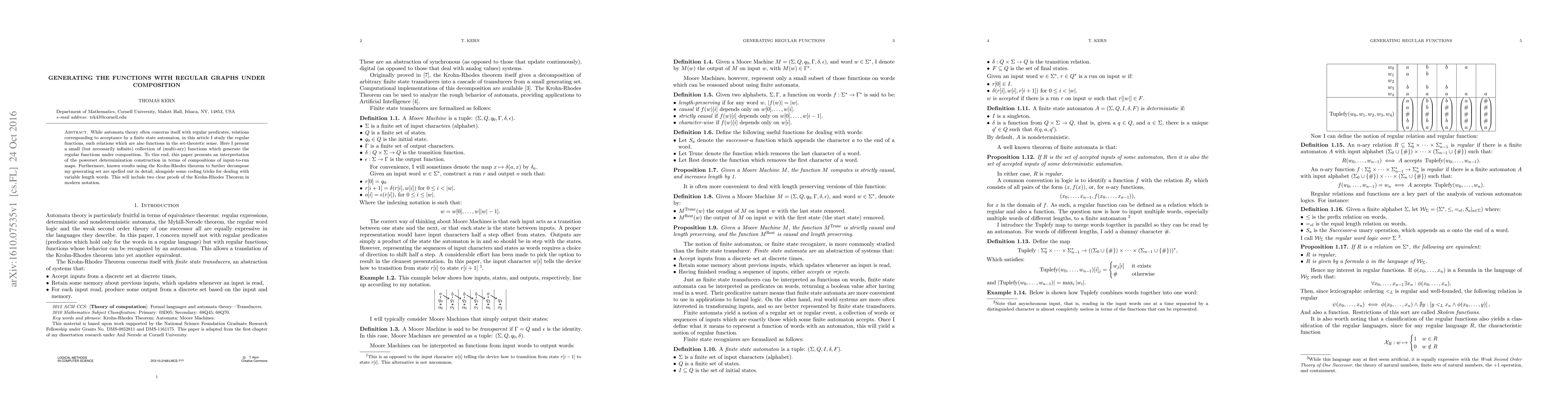 This paper explores regular functions, which are set-theoretic functions accepted by finite state automata, and presents a set of multi-ary functions that generate all such regular functions through composition. It also details the Krohn-Rhodes theorem's application in decomposing these generating functions and includes modern proofs of the theorem.