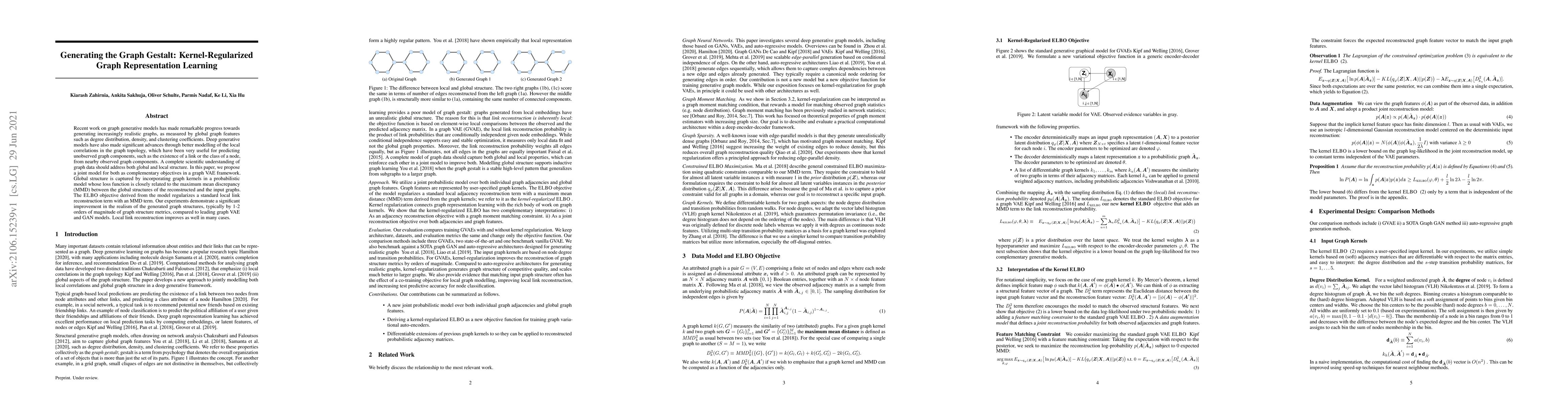 Recent work on graph generative models has made remarkable progress towards generating increasingly realistic graphs, as measured by global graph features such as degree distribution, density, and clustering coefficients. Deep generative models have also made significant advances through better modelling of the local correlations in the graph topology, which have been very useful for predicting unobserved graph components, such as the existence of a link or the class of a node, from nearby observed graph components. A complete scientific understanding of graph data should address both global and local structure. In this paper, we propose a joint model for both as complementary objectives in a graph VAE framework. Global structure is captured by incorporating graph kernels in a probabilistic model whose loss function is closely related to the maximum mean discrepancy(MMD) between the global structures of the reconstructed and the input graphs. The ELBO objective derived from the model regularizes a standard local link reconstruction term with an MMD term. Our experiments demonstrate a significant improvement in the realism of the generated graph structures, typically by 1-2 orders of magnitude of graph structure metrics, compared to leading graph VAEand GAN models. Local link reconstruction improves as well in many cases.