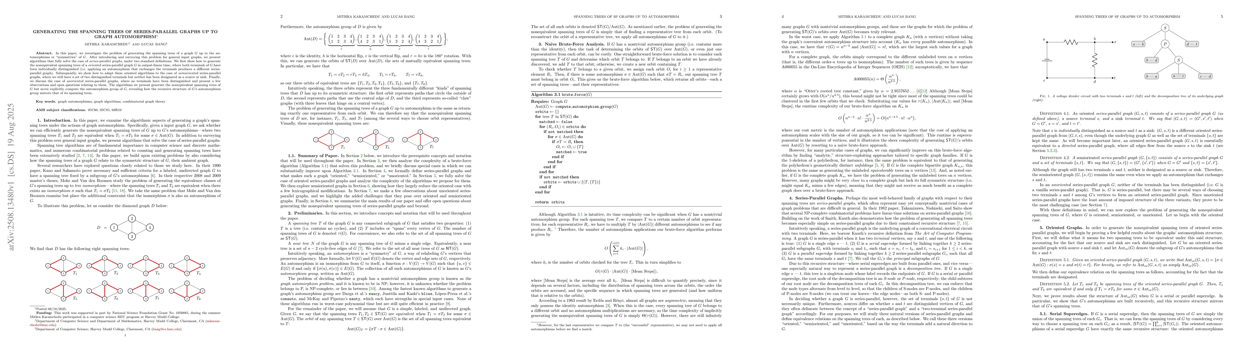 The work distinguishes itself by focusing on series-parallel graphs and efficiently generating spanning trees up to automorphisms, presenting a unique approach that avoids explicit computation of automorphism groups.