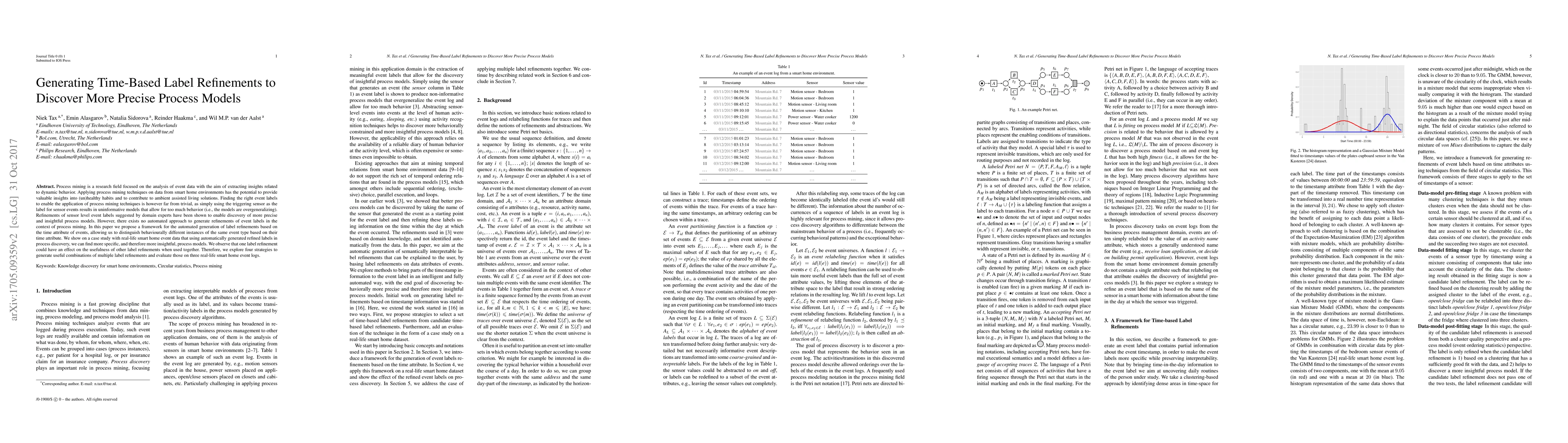 Process mining is a research field focused on the analysis of event data with the aim of extracting insights related to dynamic behavior. Applying process mining techniques on data from smart home environments has the potential to provide valuable insights in (un)healthy habits and to contribute to ambient assisted living solutions. Finding the right event labels to enable the application of process mining techniques is however far from trivial, as simply using the triggering sensor as the label for sensor events results in uninformative models that allow for too much behavior (overgeneralizing). Refinements of sensor level event labels suggested by domain experts have been shown to enable discovery of more precise and insightful process models. However, there exists no automated approach to generate refinements of event labels in the context of process mining. In this paper we propose a framework for the automated generation of label refinements based on the time attribute of events, allowing us to distinguish behaviourally different instances of the same event type based on their time attribute. We show on a case study with real life smart home event data that using automatically generated refined labels in process discovery, we can find more specific, and therefore more insightful, process models. We observe that one label refinement could have an effect on the usefulness of other label refinements when used together. Therefore, we explore four strategies to generate useful combinations of multiple label refinements and evaluate those on three real life smart home event logs.