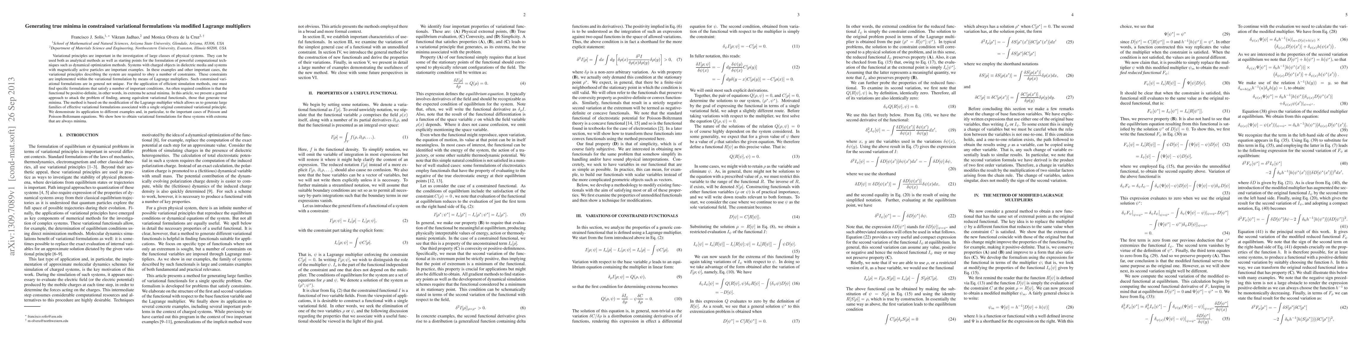 This paper presents a method to generate true minima in constrained variational formulations by modifying Lagrange multipliers, ensuring positive-definite functionals. The approach is demonstrated through applications to Poisson and Poisson-Boltzmann equations, achieving formulations where extrema are guaranteed to be minima.