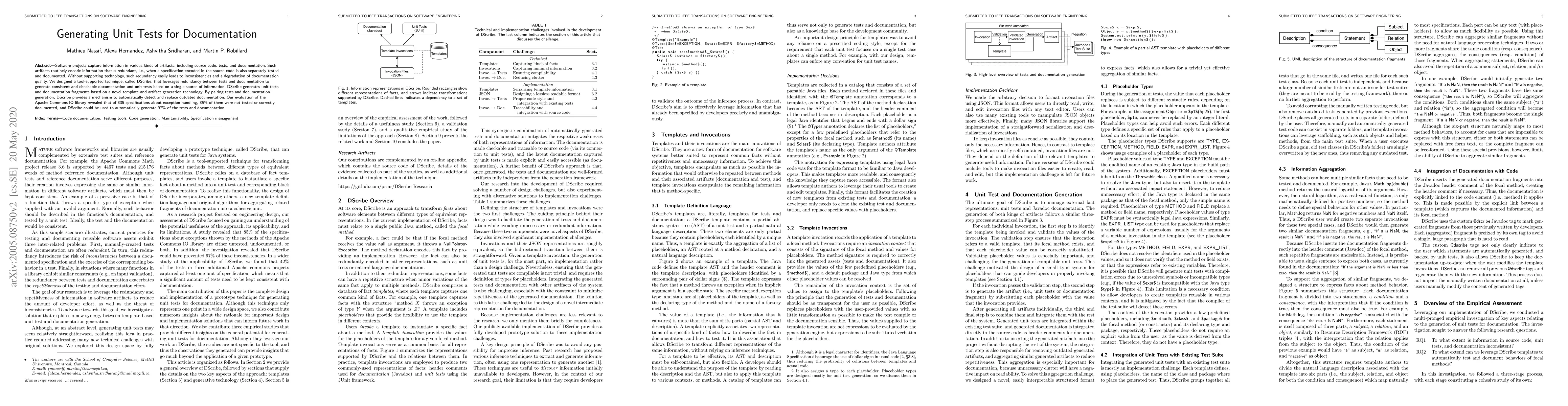 Software projects capture information in various kinds of artifacts, including source code, tests, and documentation. Such artifacts routinely encode information that is redundant, i.e., when a specification encoded in the source code is also separately tested and documented. Without supporting technology, such redundancy easily leads to inconsistencies and a degradation of documentation quality. We designed a tool-supported technique, called DScribe, that leverages redundancy between tests and documentation to generate consistent and checkable documentation and unit tests based on a single source of information. DScribe generates unit tests and documentation fragments based on a novel template and artifact generation technology. By pairing tests and documentation generation, DScribe provides a mechanism to automatically detect and replace outdated documentation. Our evaluation of the Apache Commons IO library revealed that of 835 specifications about exception handling, 85% of them were not tested or correctly documented, and DScribe could be used to automatically generate 97% of the tests and documentation.