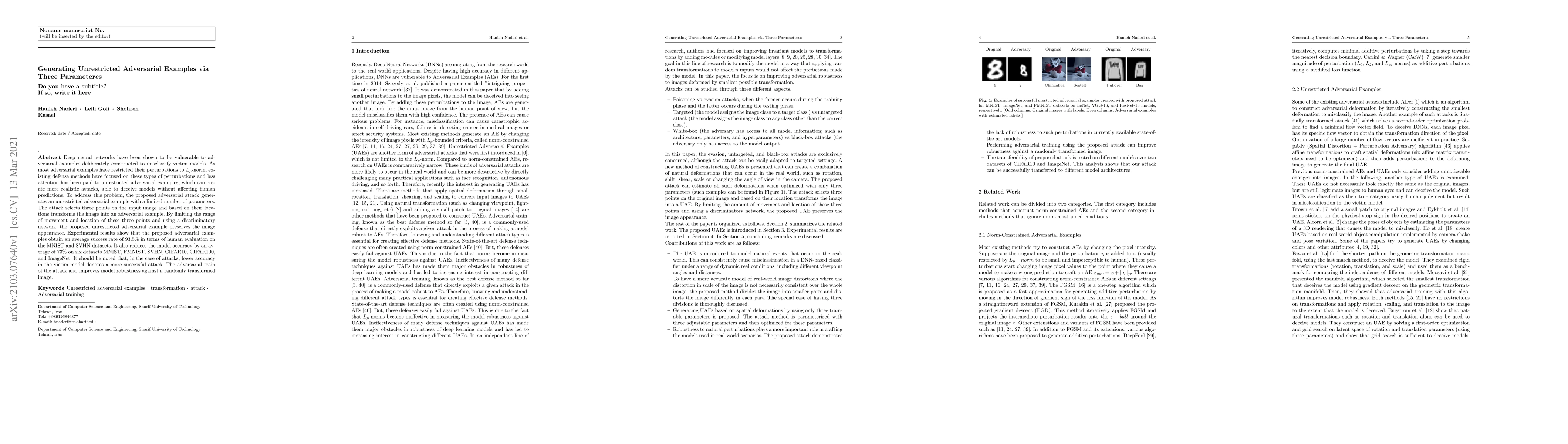 This paper proposes a novel method to generate unrestricted adversarial examples using only three parameters, focusing on creating realistic attacks that can deceive deep neural networks without affecting human perception. The method achieves a high success rate and significantly reduces model accuracy across multiple datasets.